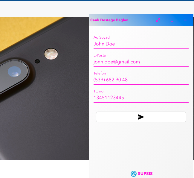 Ziyaretcileriniz henüz chat balonuna tıklayıp destek almadan önce onun kişisel bilgileri supsis sdk'e önceden verirseniz otomatik bilgiler set edilir. Sizin sistemizdeki ad soyad ve email bilgileri ile supsis destek üzerinden chat başlatabilir.