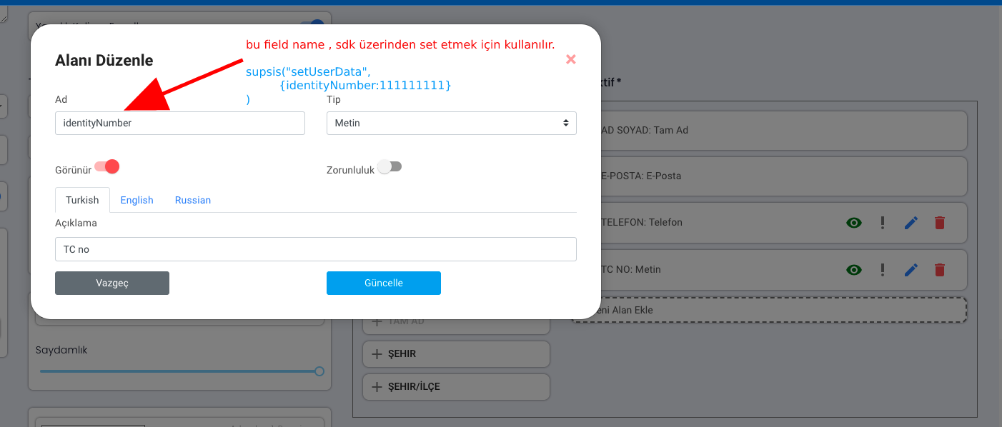 - Panel üzerinden oluşturduğunuz Özelleştirilmiş Kullanıcı Verilerini değiştebilirsiniz