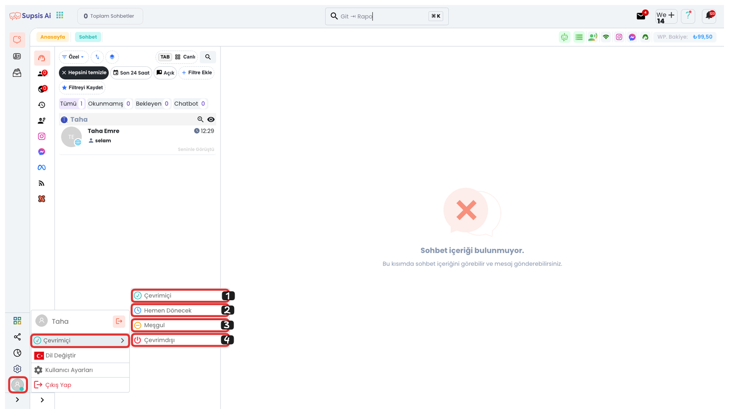 Temsilci kısa bir süre için ayrılmıştır ancak yakında geri dönecektir. Bu mod, temsilcinin kısa bir molada olduğunu veya anlık bir iş ile ilgilendiğini belirtir ve hızlı bir şekilde sisteme döneceği anlamına gelir. "Hemen Dönecek" modunda temsilciye yeni sohbet atamaları yapılmaz.