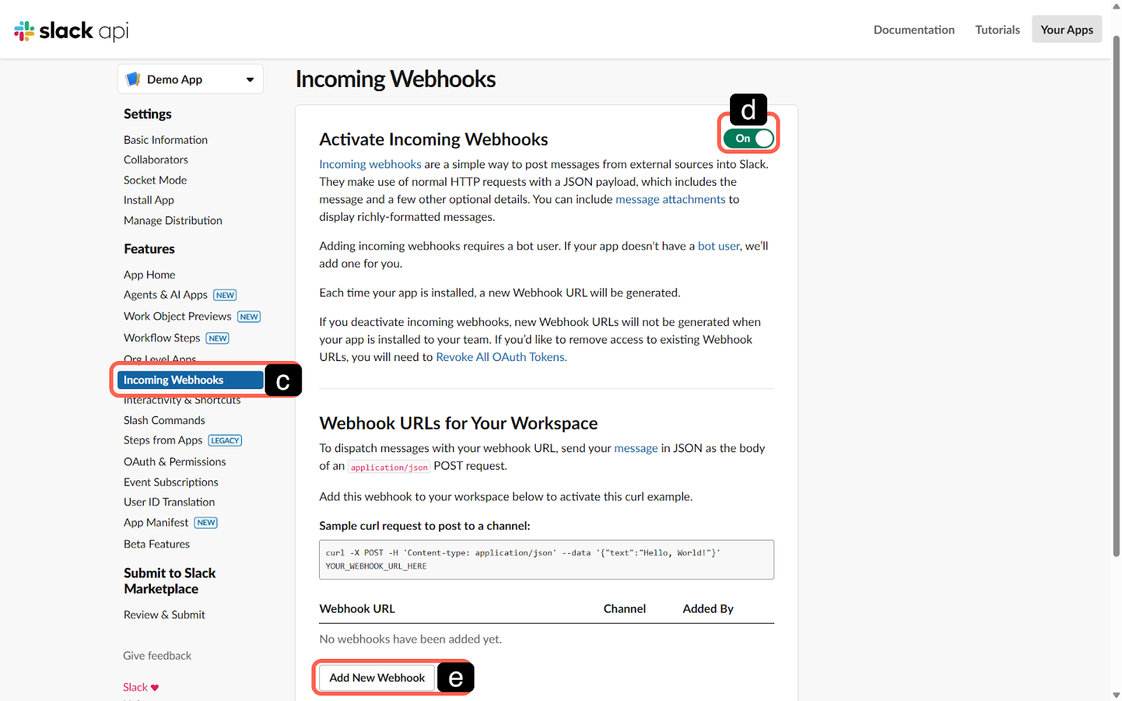 Oluşturulan uygulamanın içerisine giriş yaparak, açılan uygulama panelindeki özellikler (Features) kategorisinde bulunan Webhook menüsüne giriş yapınız. Bu alan, uygulamanızın Webhook özelliğini yapılandırabildiğiniz menüdür.