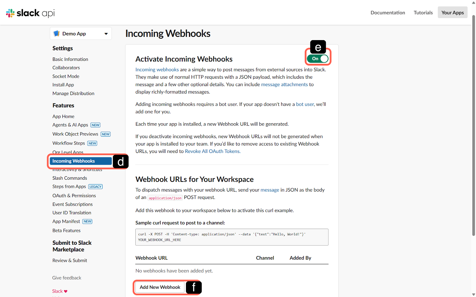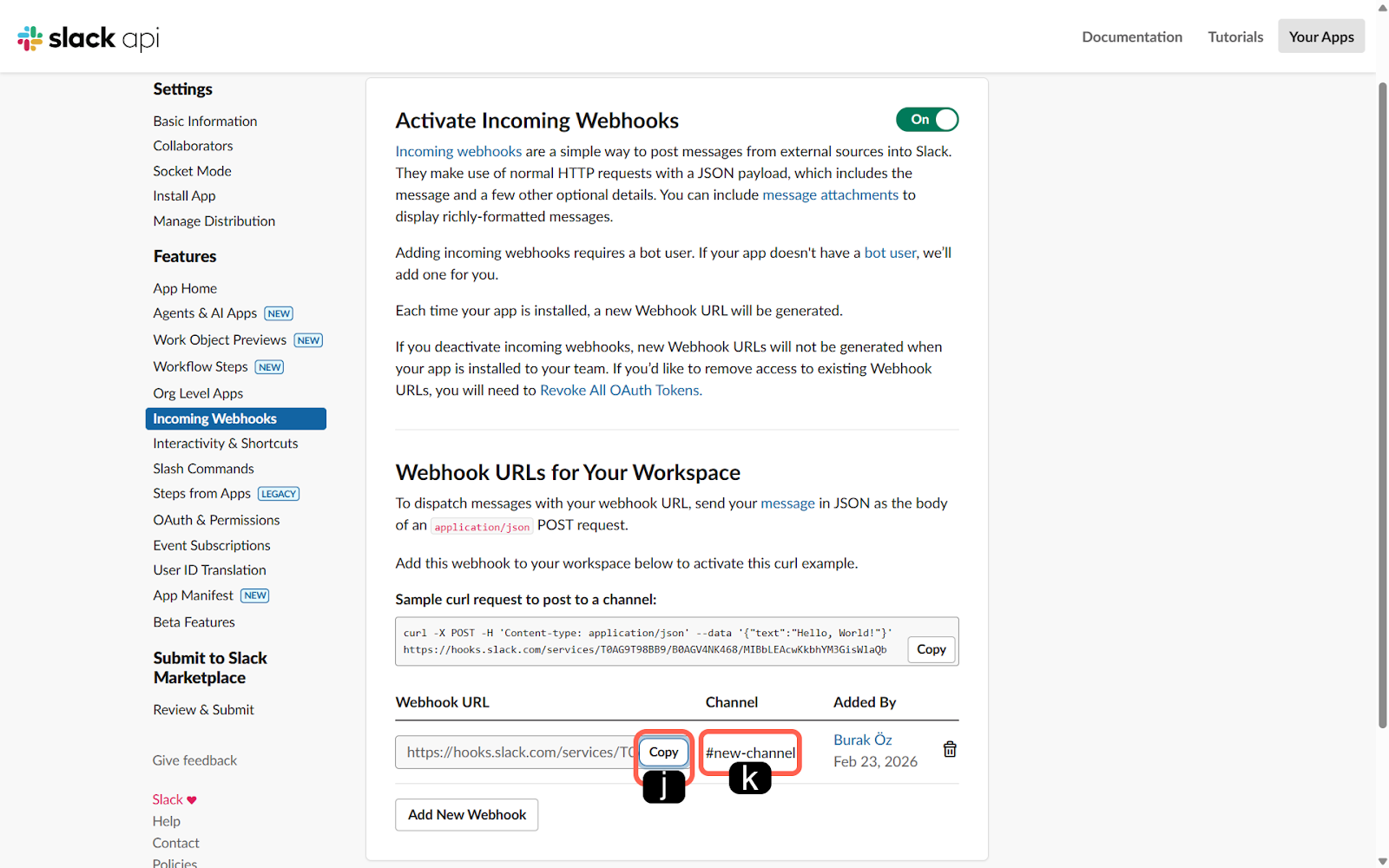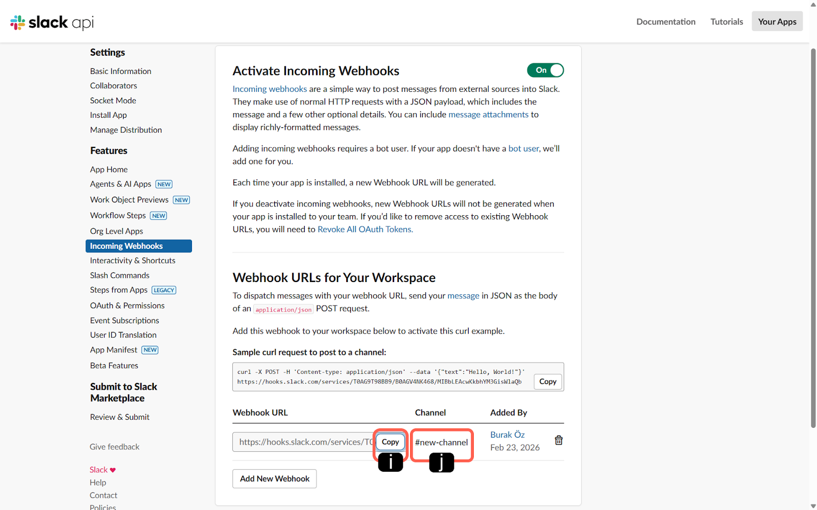 Slack kanalınıza veri akışı sağlayacak yeni Webhook bağlantısını oluşturabileceğiniz butonudur.