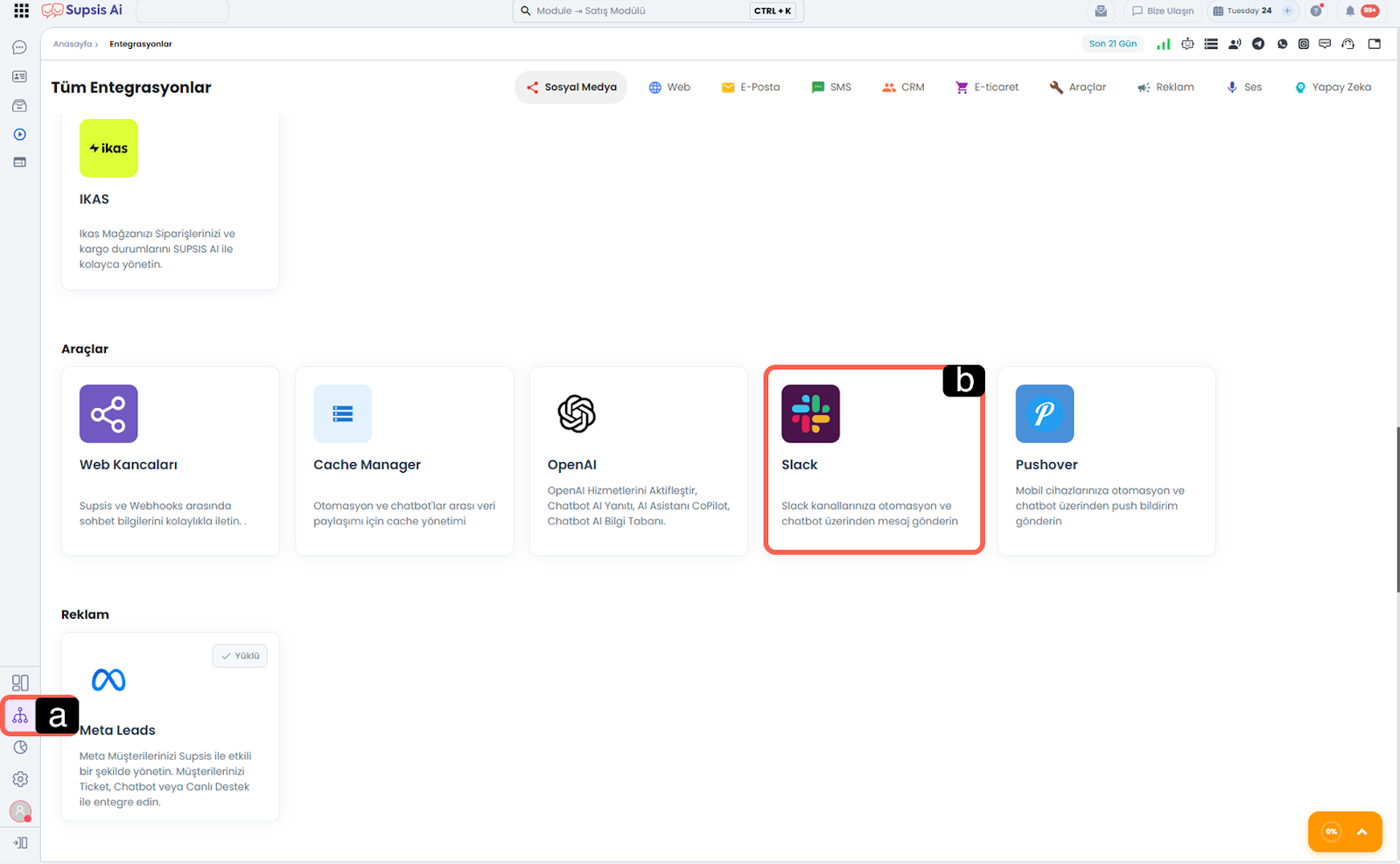 Supsis AI panelinizin sol menüsünde yer alan genel entegrasyonlar sekmesine giriş yapın.