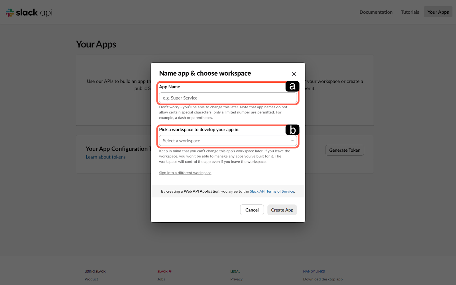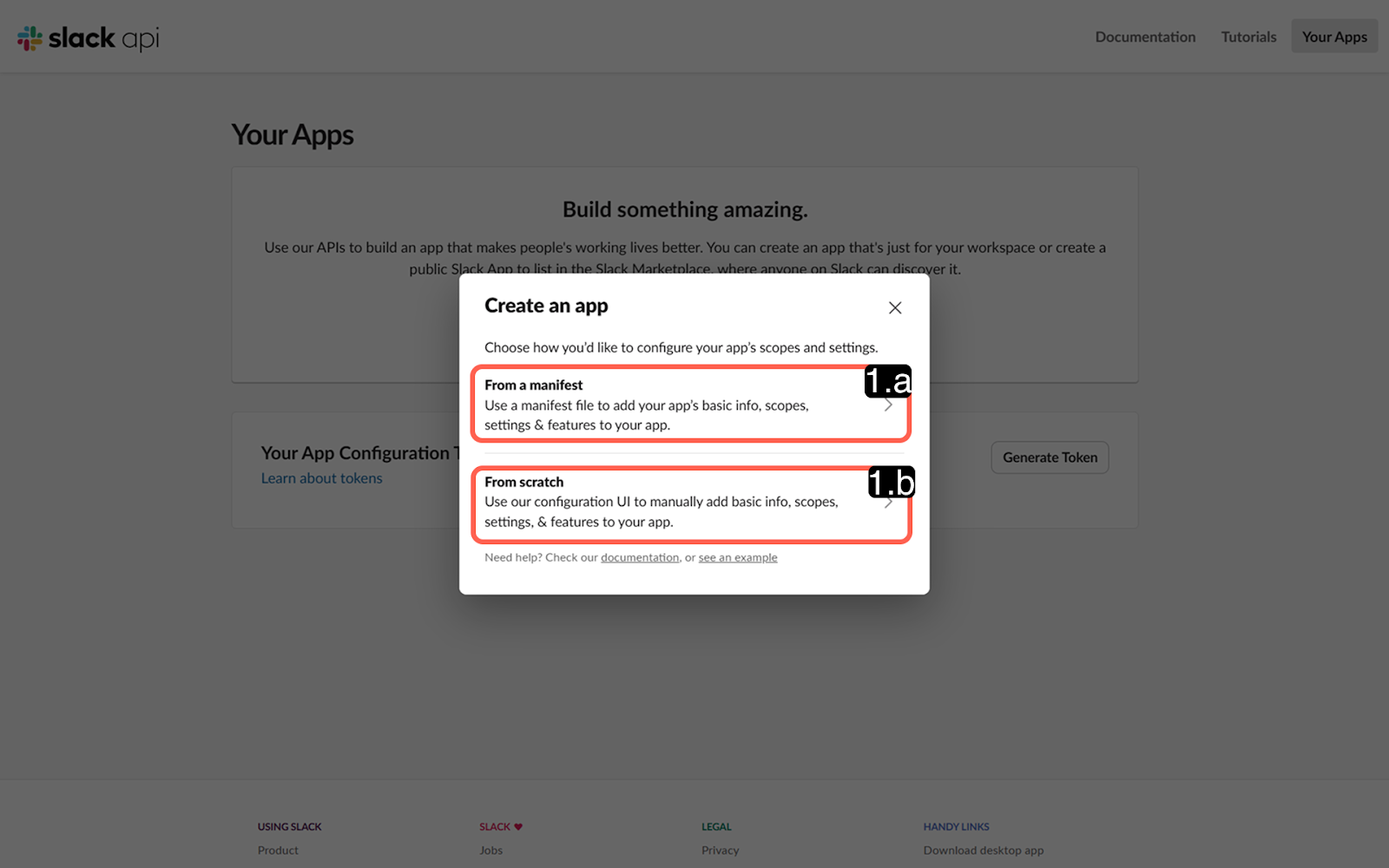 Slack hesabınıza giriş yaparak ve sayfada yer alan "Create an App" (Uygulama Oluştur) butonuna tıklayın. Karşınıza uygulamayı oluşturmak için iki farklı yöntem çıkacaktır.