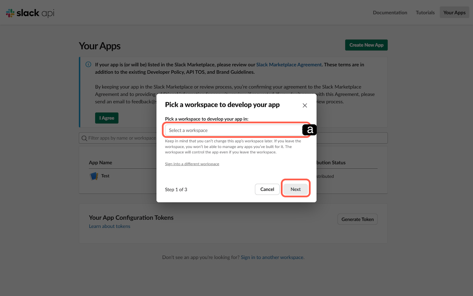 Uygulamanın hangi Slack çalışma alanına kurulacağını belirlediğiniz menüdür.