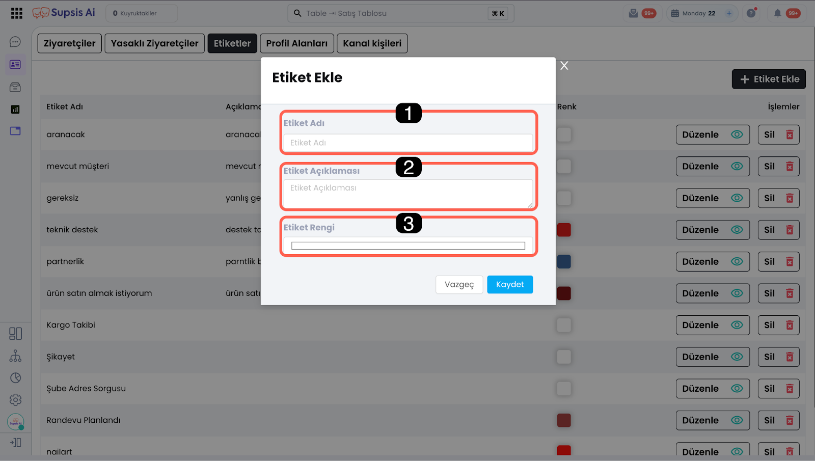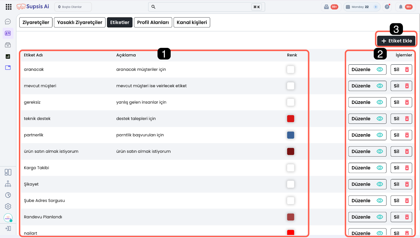 Bu alan, Supsis içerisinde kullanıcıları daha etkili şekilde sınıflandırmak ve süreçlerinizi daha kolay yönetmek için yeni etiketler oluşturmanızı sağlar. Oluşturulan etiketler; kullanıcı profillerinde, filtreleme işlemlerinde, chatbot ve otomasyonun filtreleme süreçlerinde aktif olarak kullanılabilir.