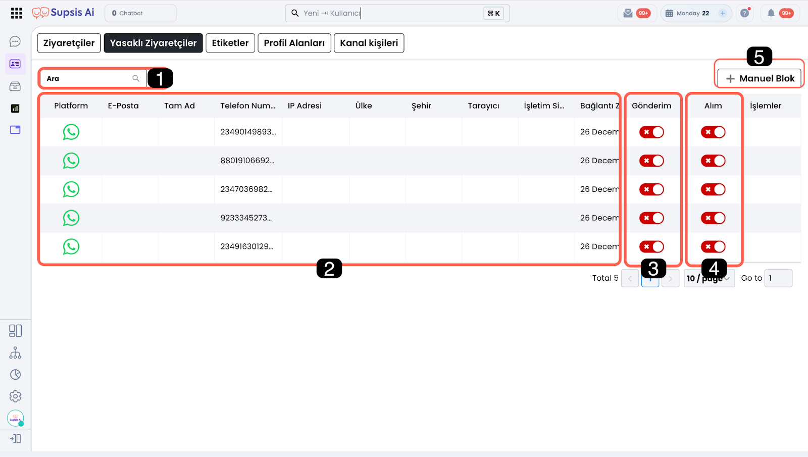Bu alan üzerinden; telefon numarası, ad-soyad, IP adresi veya e-posta adresi gibi temel bilgiler üzerinden arama yaparak engellenmiş kullanıcıyı kolayca bulabilirsiniz.