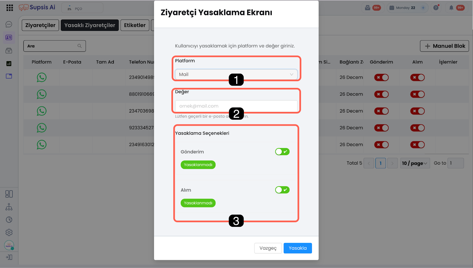 Bu alan üzerinden, herhangi bir sohbet geçmişi olmadan da kullanıcıları manuel olarak engelleyebilirsiniz. Yasaklama işlemi, seçilen platform ve girilen değere göre uygulanır.