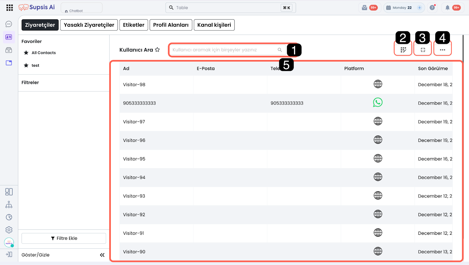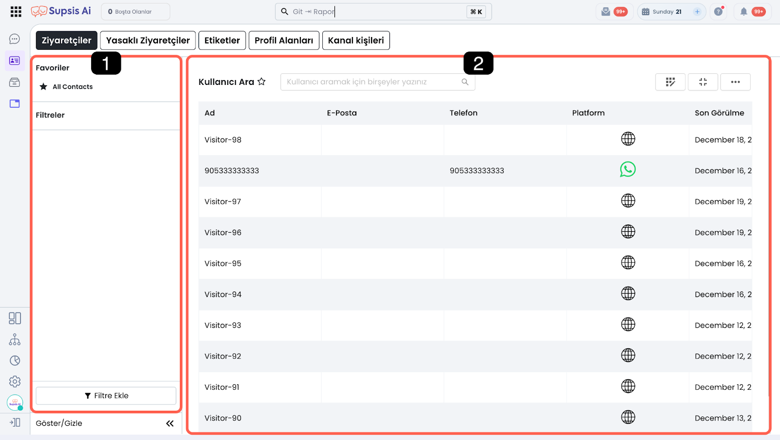Bu alan üzerinden kişilere ait temel bilgiler, iletişim kanallarından elde edilen veriler, sohbet oturumu detayları ve profil alanları tablo formatında listelenir. Ayrıca tablo yapısını özelleştirerek yalnızca ihtiyaç duyduğunuz verileri görüntüleyebilir ve indirebilirsiniz.