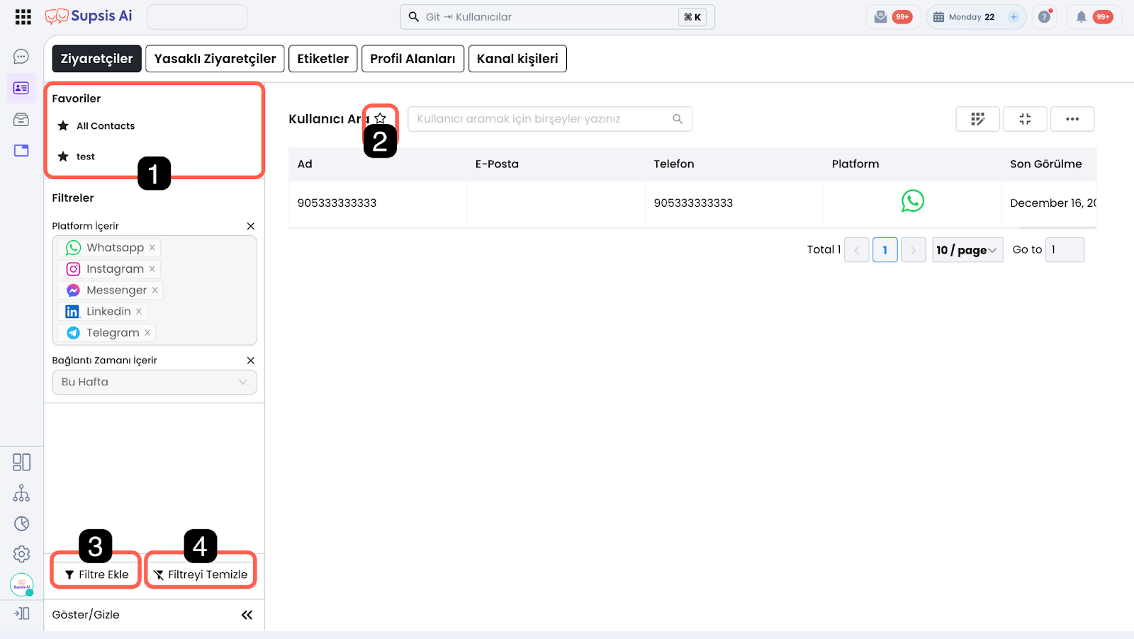 Telefon numarasına göre filtreleme yaparak belirli numaralardan gelen kullanıcıları listelemenizi sağlar.