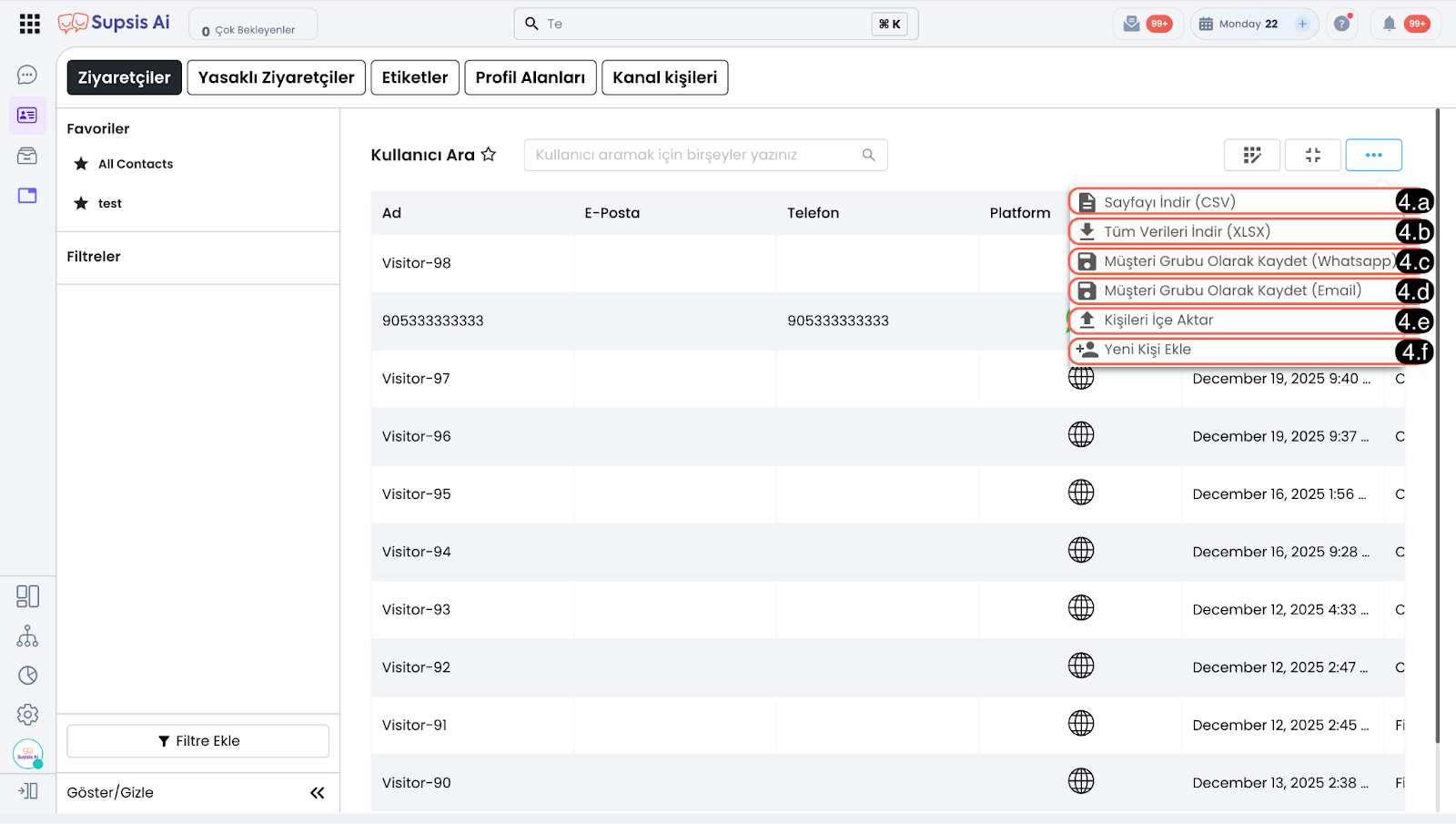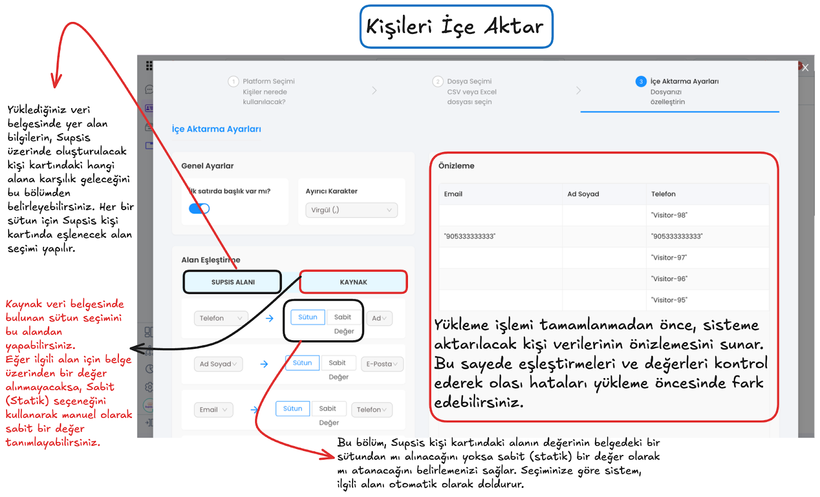 Bu alan, Supsis sistemine toplu kişi eklemek için kullanılır. İçe aktarım işlemi için yükleyeceğiniz dosya Excel veya CSV formatında olmalıdır. Yüklenen veriler, kişi kartlarında kayıt altına alınır ve bu bilgiler; - Sohbet süreçlerinde, - Chatbot ve otomasyonlarda, - Filtreleme ve segmentasyon işlemlerinde aktif olarak kullanılabilir.