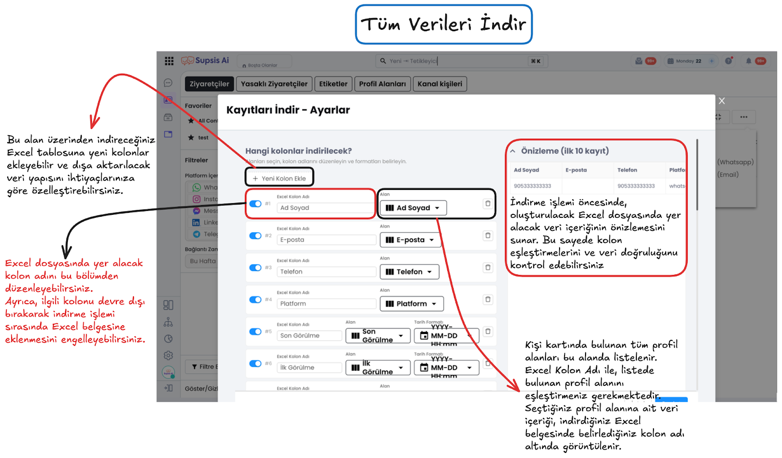 Bu seçenek, uyguladığınız filtre kriterlerine uyan tüm kişi kayıtlarını Excel formatında indirmenizi sağlar.Bu indirme işleminde, tablo ayarlarından yapılan görünürlük işlemleri dikkate alınmaz. Butona tıkladıktan sonra açılan ekranda, Excel dosyasında yer alacak kolonlar için Supsis kişi kartı alanı eşleştirmesi yapmanız gerekmektedir. Bu yöntem, kapsamlı raporlama ve arşivleme ihtiyaçları için önerilir.
