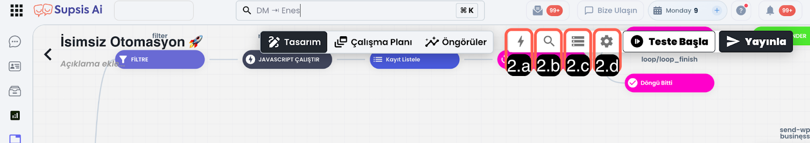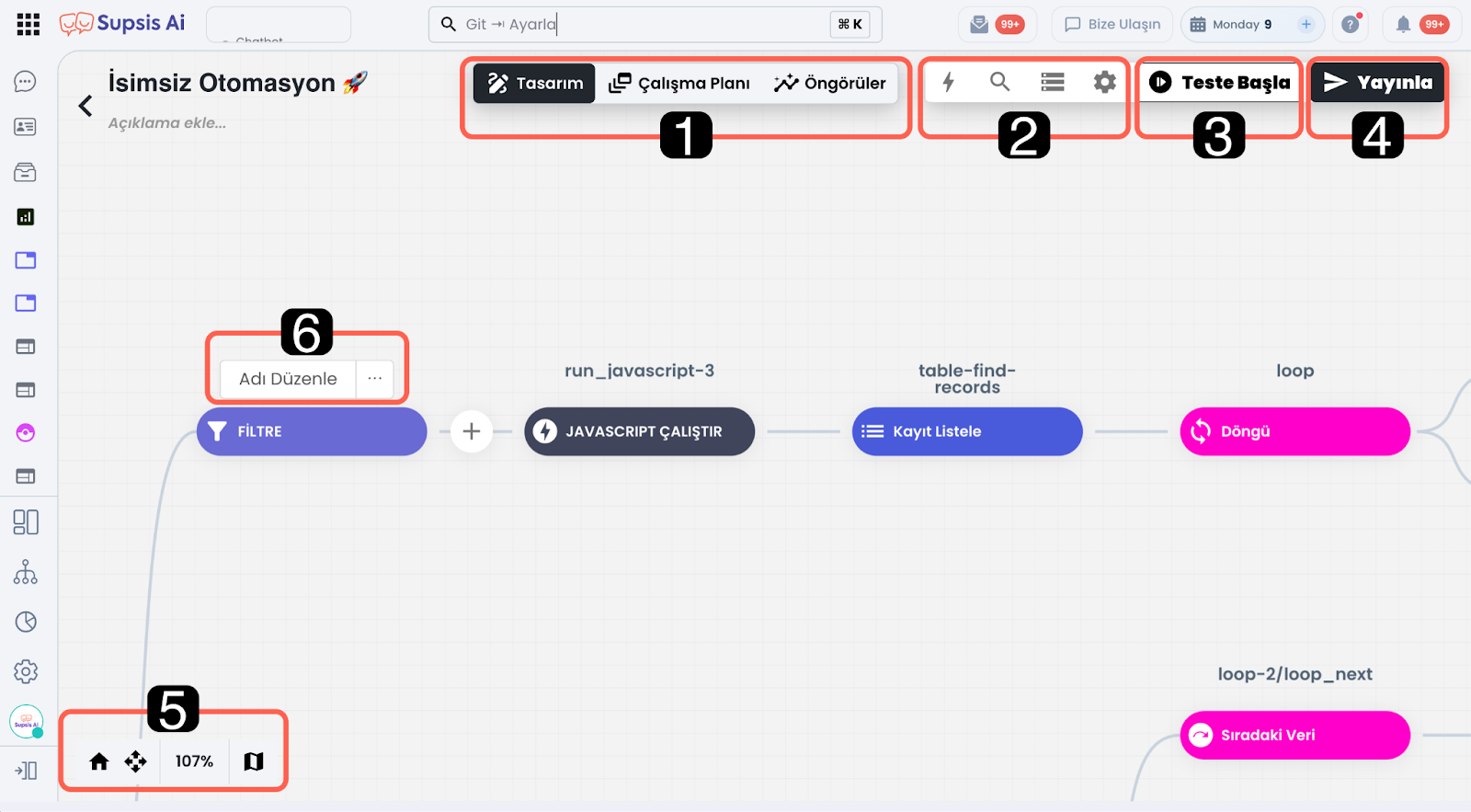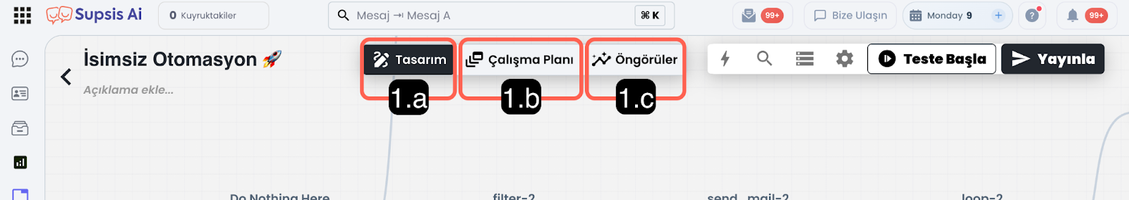 Bu alan, tasarladığınız otomasyonun planlamasını ve detaylı analizlerini kontrol edebileceğiniz üst menü grubudur.