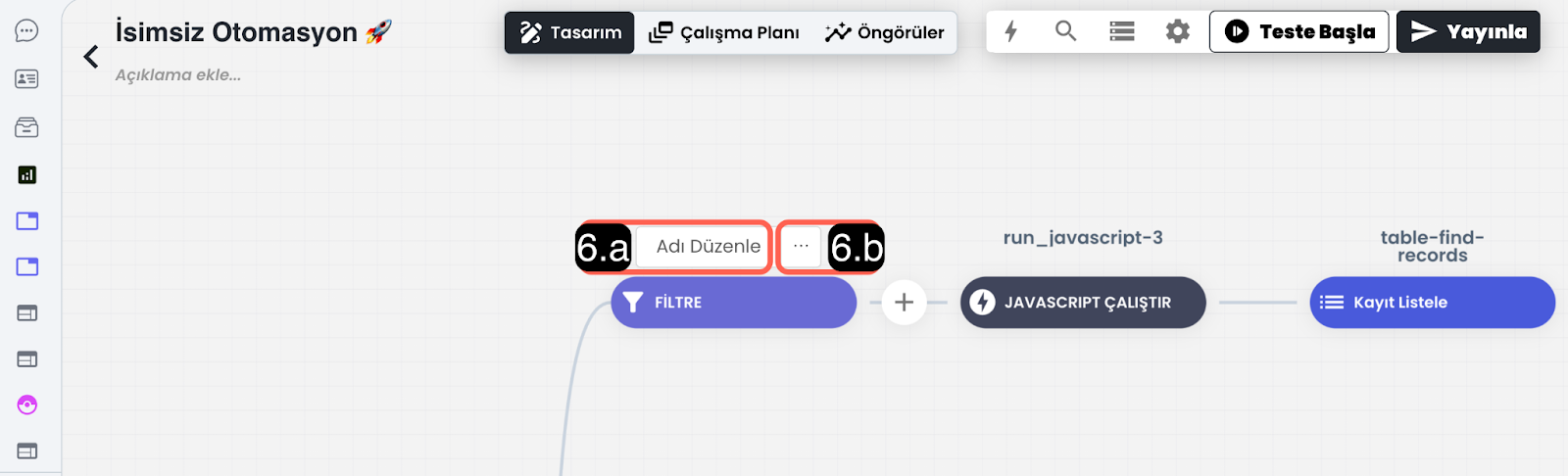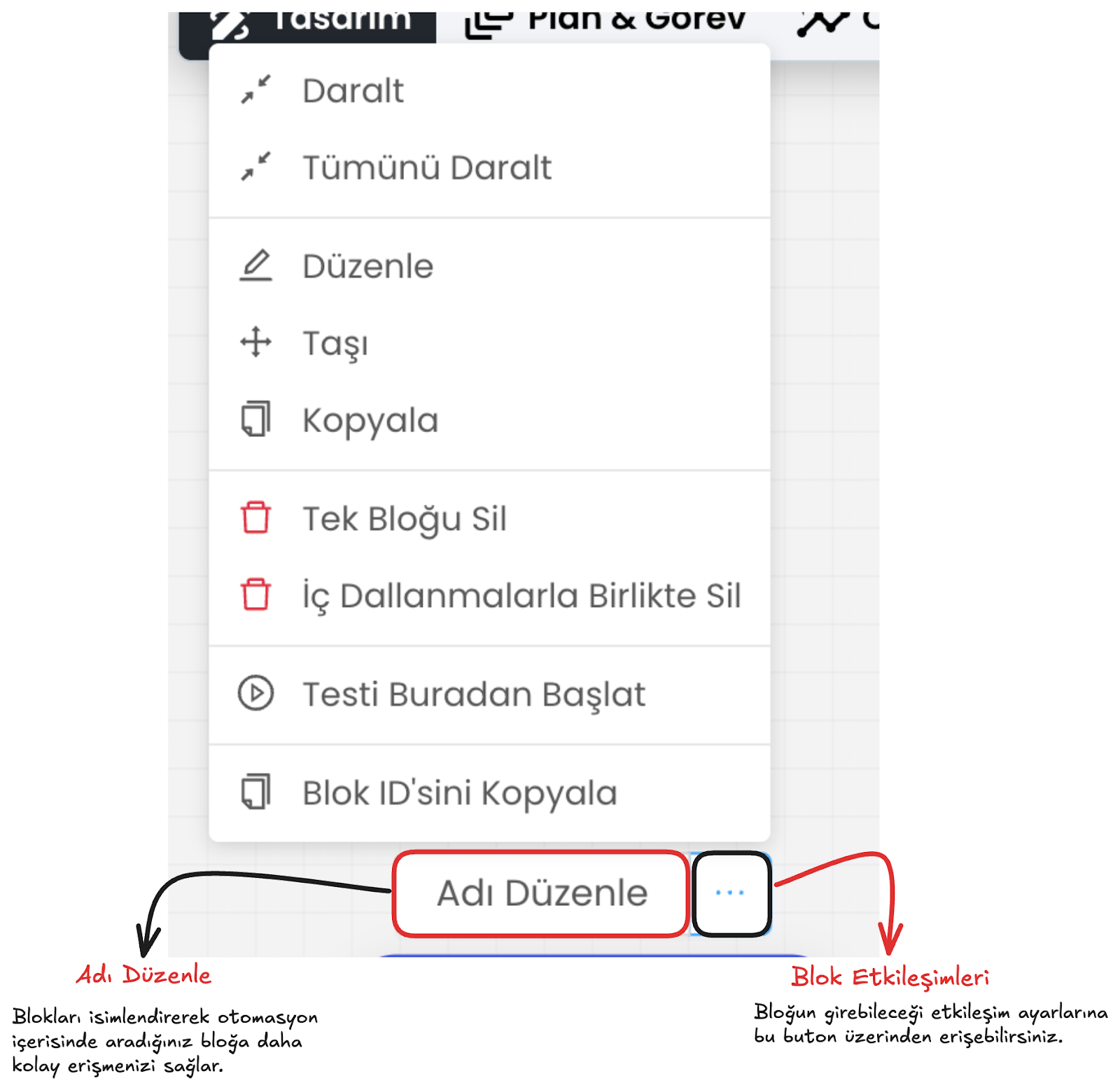 Düzenle: Bloğun yapacağı aksiyon içeriğini düzenleyeceğiniz ekranı açar. Bu ekrana hem buradaki düzenle butonu üzerinden hem de ilgili bloğun üzerine tıklayarak erişebilirsiniz.