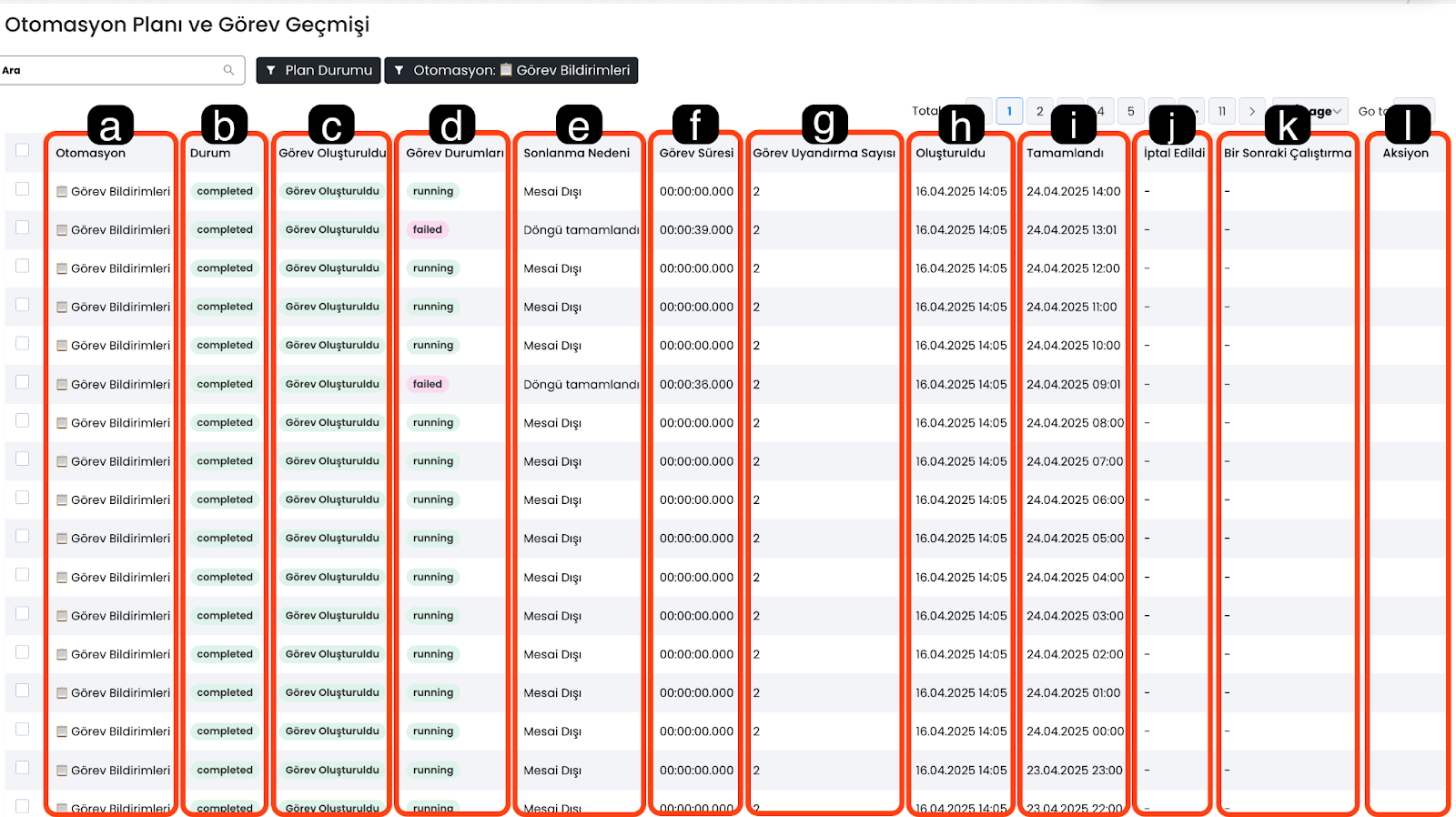 j. İptal Edildi: Otomasyon iptal edildiyse iptal sebebini gösterir.