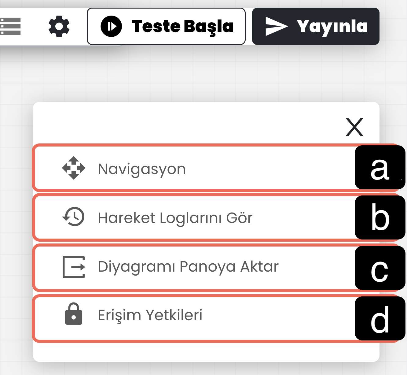 Diyagram ekranında (çalışma alanında) rahatça gezinmenizi ve senaryo tasarımını detaylıca kontrol etmenizi sağlayan görsel arayüz araçlarıdır.