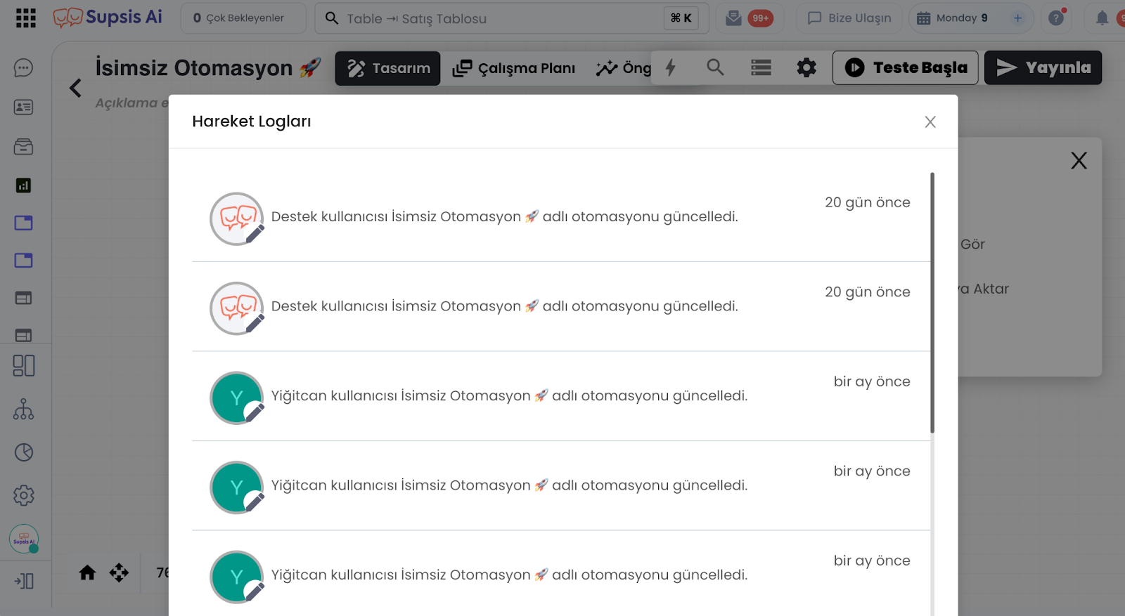 Bu otomasyon üzerinde, Supsis AI panelindeki kullanıcıların yaptığı işlemlerin ve yapısal değişikliklerin kayıt geçmişine ulaşmanızı sağlar.