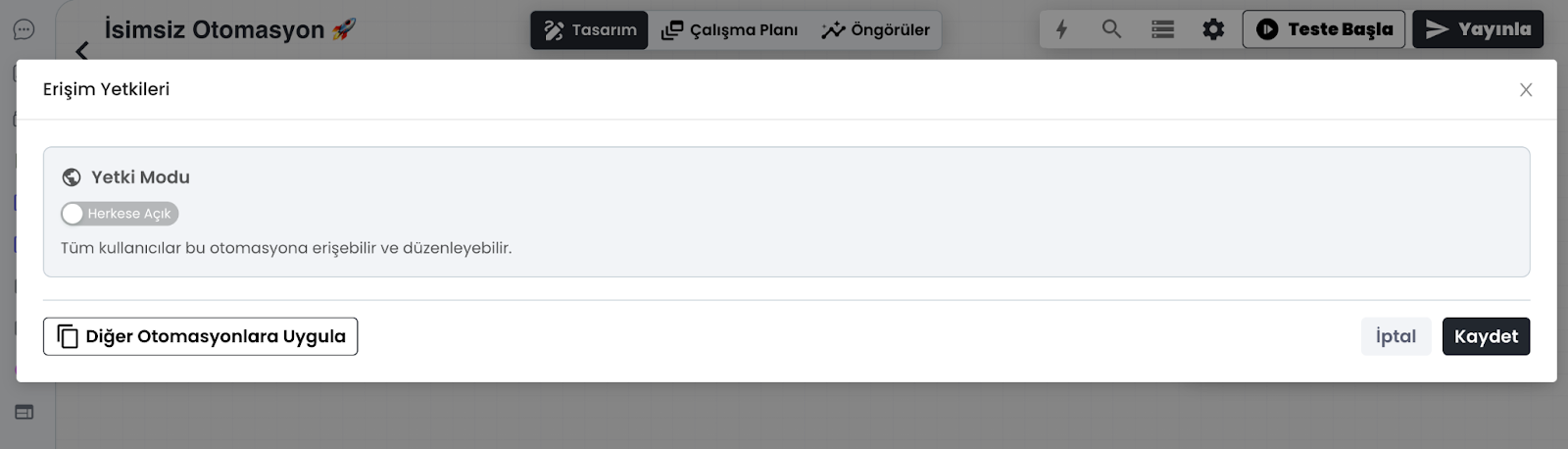 Sisteminizdeki hangi kullanıcıların, ekiplerin veya departmanların bu otomasyonu görüntüleyebileceğini ve üzerinde düzenleme yapabileceğini belirlediğiniz güvenlik ve yetkilendirme ayarıdır.