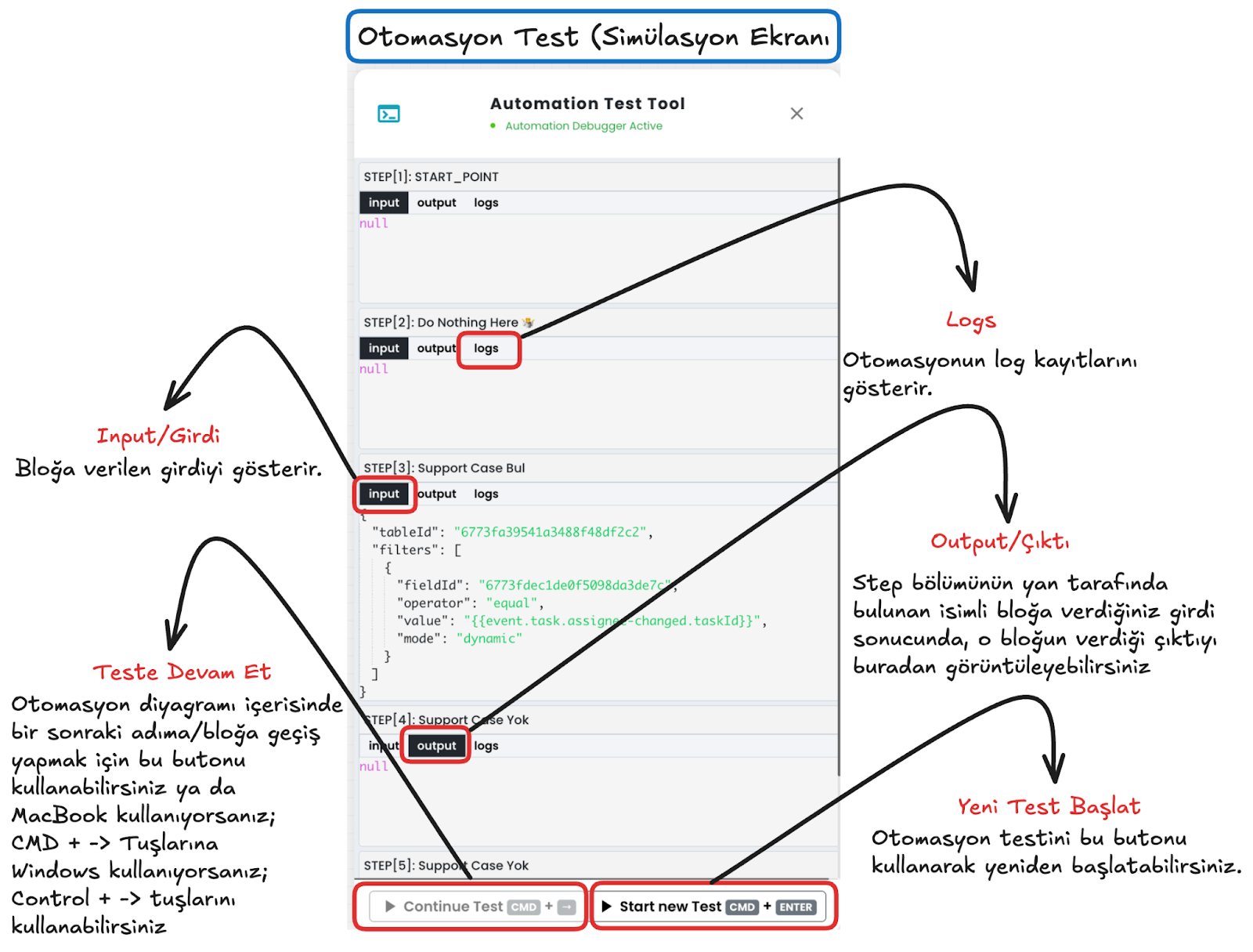 Test özelliği, oluşturduğunuz otomasyonu canlıya (yayına) almadan önce simülasyon ortamında denemenizi sağlar. Bu test ortamı, dışarıdan veya sistemden gelen örnek verilerin, bloklar tarafından nasıl işlendiğini adım adım görmenize olanak tanır. İlgili bloğun aldığı ham veriyi (input) ve işlem sonrasında verdiği çıktıyı (output) anlık olarak görüntüleyebilirsiniz.