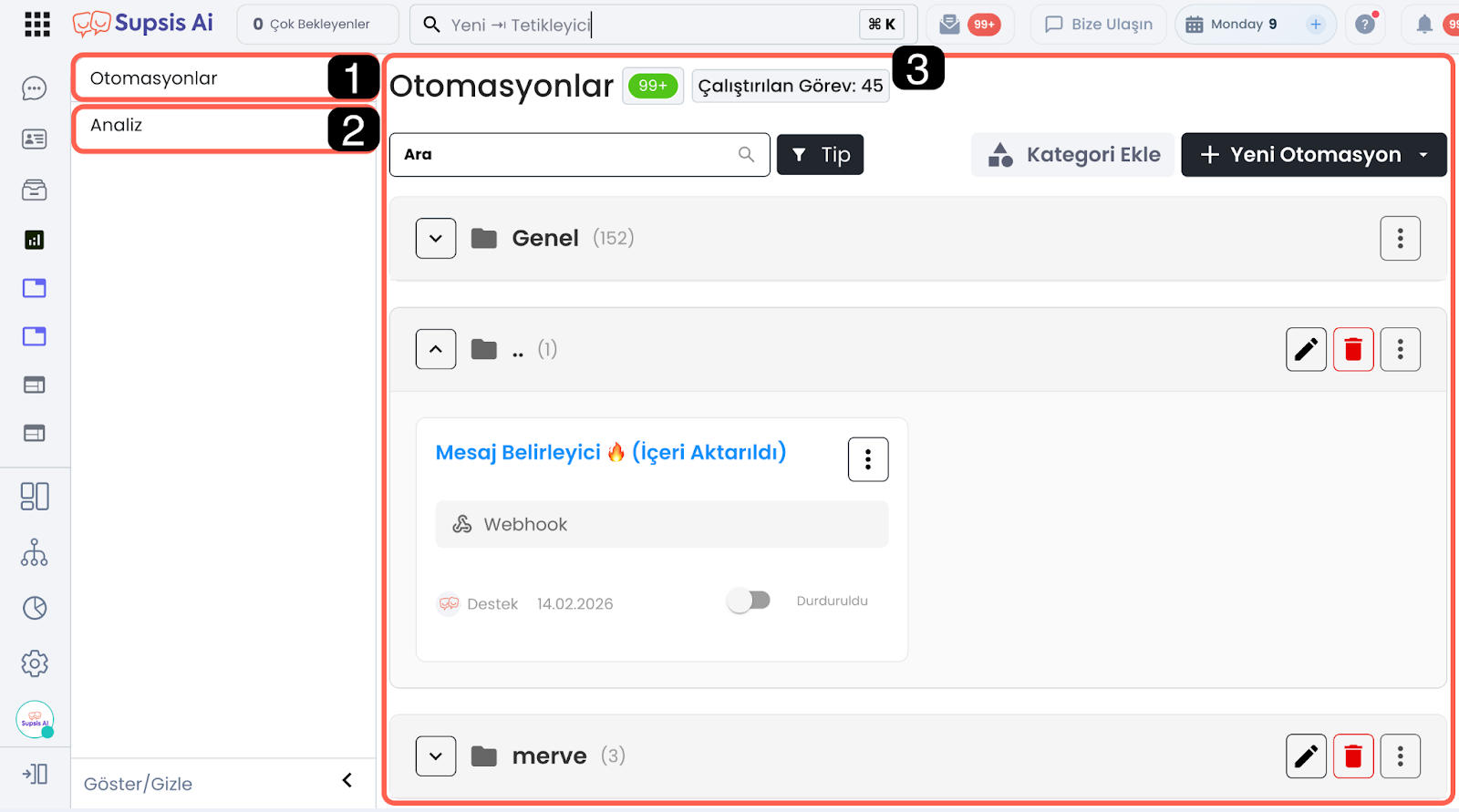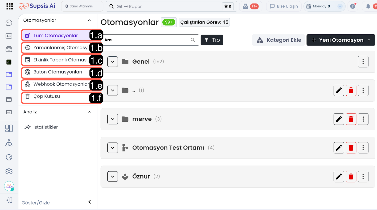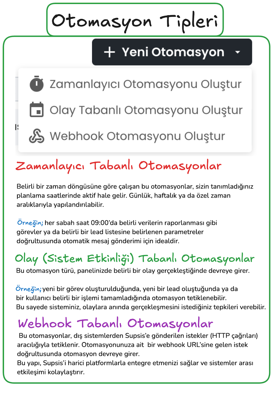 Sistemde kurulu olan tüm otomasyon türlerine ait (Zamanlanmış, Etkinlik Tabanlı, Webhook, Buton) içeriklere toplu olarak bu menü üzerinden erişebilir ve tüm senaryolarınızı tek bir listede görüntüleyebilirsiniz.