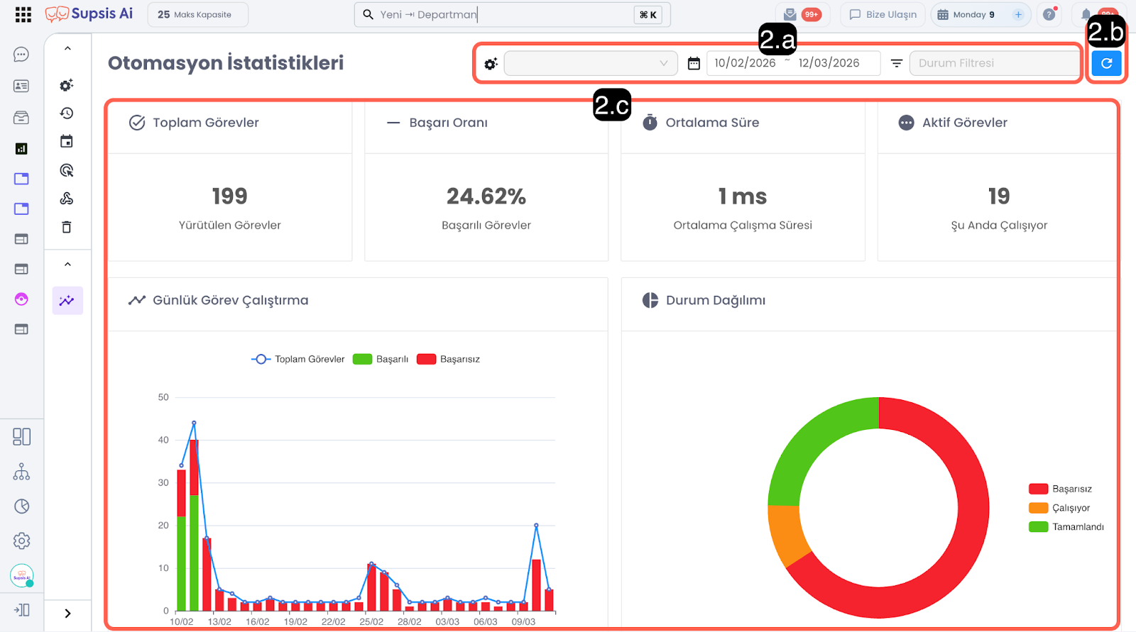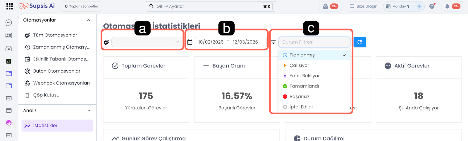 - Toplam Görevler: Seçili tarih aralığında tetiklenen ve çalıştırılan toplam otomasyon işlemi sayısıdır.
