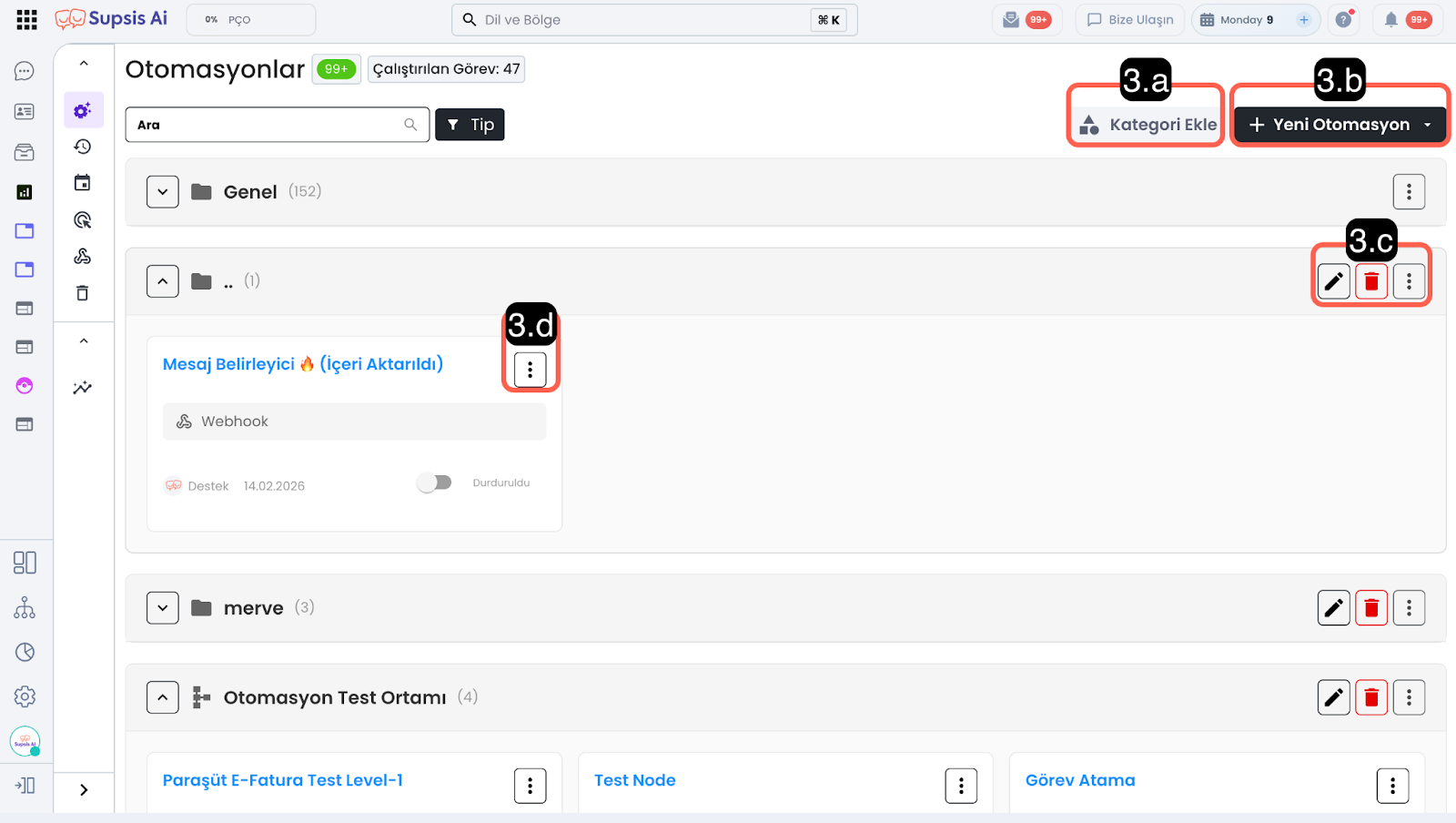 Otomasyon senaryolarınızı projelerinize, departmanlarınıza veya işlevlerine göre gruplandırmak için yeni otomasyon klasörleri oluşturmanızı sağlar.