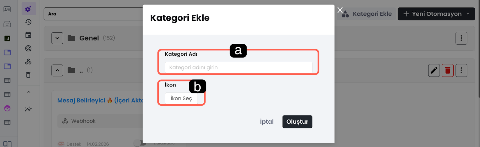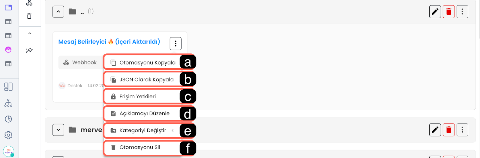 Silme işleminden önce veya düzenleme amacıyla, bir kategori içerisindeki tüm otomasyonları toplu olarak başka bir kategoriye aktarmanızı sağlar.