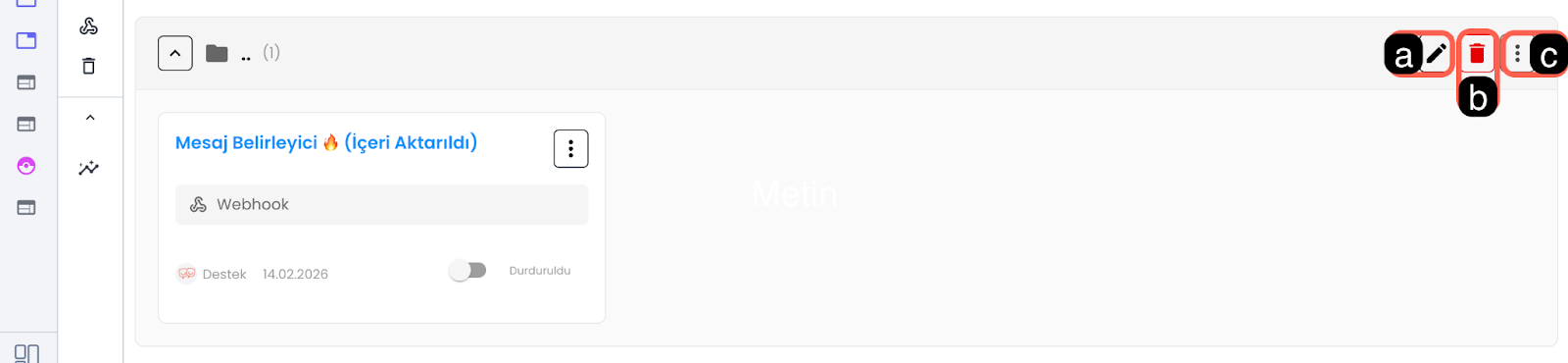 Tabloda listelenen her bir otomasyon satırının sağ tarafında bulunan menü üzerinden, ilgili senaryoya ait spesifik yönetim eylemlerini gerçekleştirebilirsiniz.