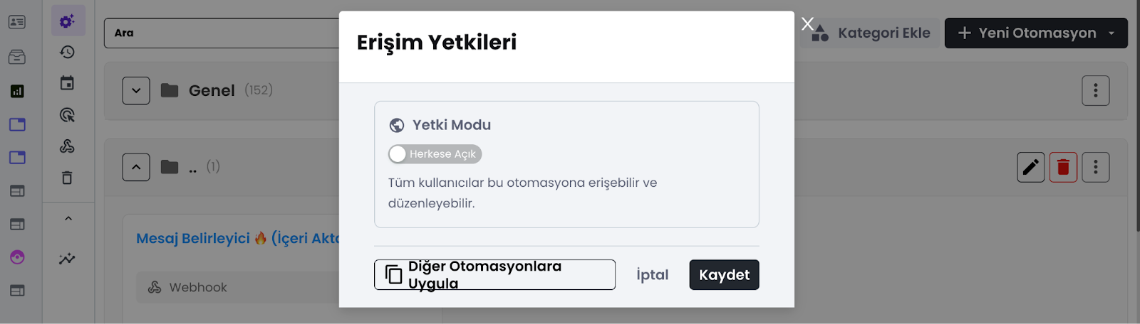 Bu otomasyonu sistemdeki hangi kullanıcıların veya ekiplerin görüp düzenleyebileceğini belirlediğiniz yetkilendirme alanıdır.