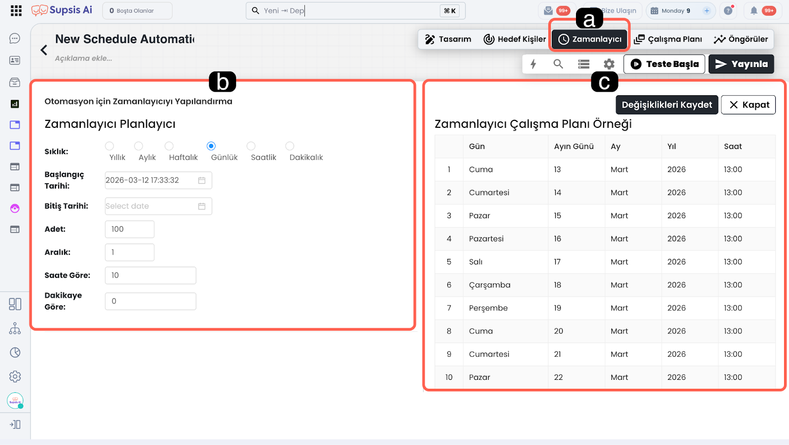 Otomasyonun çalışma periyotlarını ve sıklığını belirlediğiniz yapılandırma alanıdır. Otomasyon başlangıç tarihi alanında belirlenen tarihte başlar. Sıklık alanından belirlenen sıklıkta, bitiş tarihine kadar planlı mesaj gönderimi sağlar.