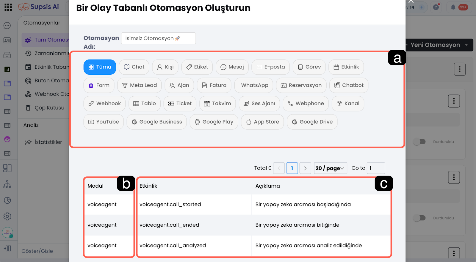 Bu bölümde, otomasyonu tetikleyecek olan, Supsis Ai kaynağını belirlemek için kullanabileceğiniz modül filtreleme alanıdır. Supsis Ai ekosisteminde yer alan ve etkinlik tabanlı otomasyonu tetikleyebilecek tüm entegrasyonlar ve modüller burada kategorize edilmiştir.