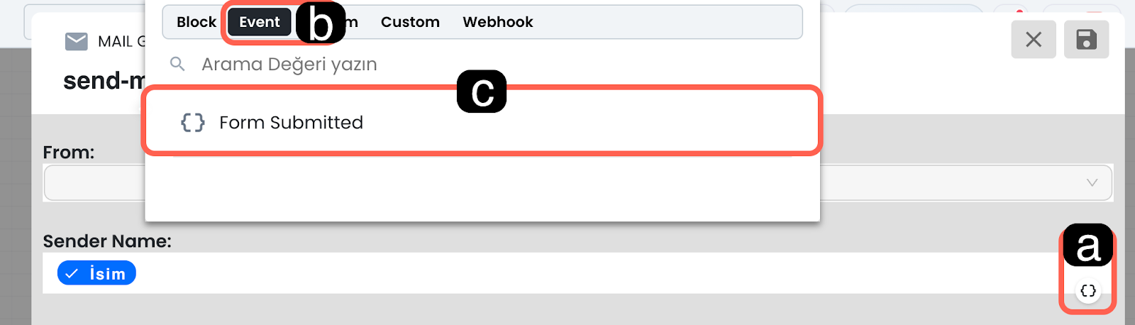 Etkinlik verisini okumak için, bu veri ile işlem yapmasını istediğiniz otomasyon bloğunun içerisine giriş yaparak aşağıdaki adımları izleyebilirsiniz.