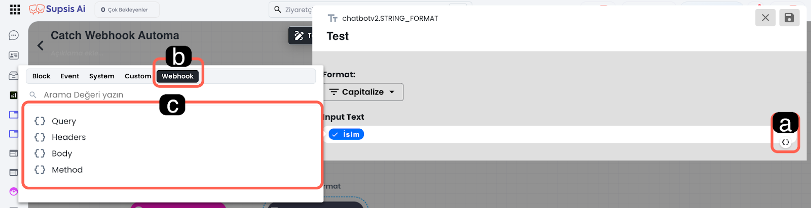 Otomasyonun dinamik gelen Webhook verilerini okuyabilmesi için, obje hiyerarşisine göre JSON şemasında bulunan her bir keyin arasına nokta (“.”) konulmalı ve değer, çift süslü parantez ( {{ }} ) içerisine alınmalıdır.