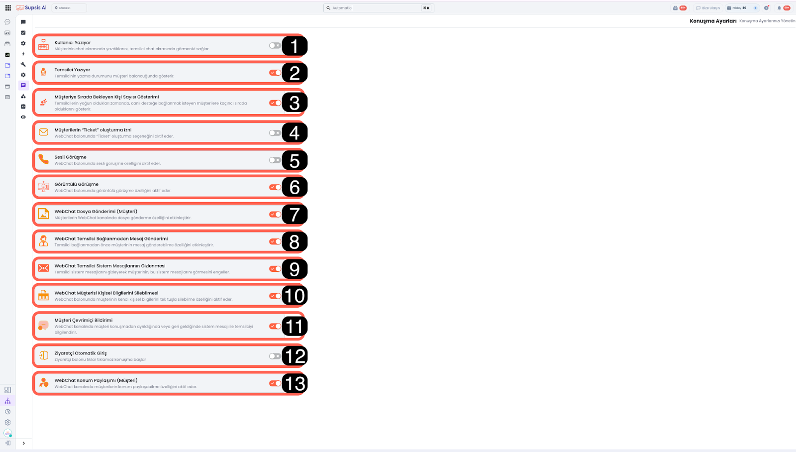 Bu bölüm, WebChat kanalında müşteri ve temsilci etkileşimini, görünüm bildirimlerini ve mesajlaşma davranışlarını kontrol etmenizi sağlar. Kullanıcı deneyimi, gizlilik ve iletişim akışı bu ayarlar üzerinden yönetilir.