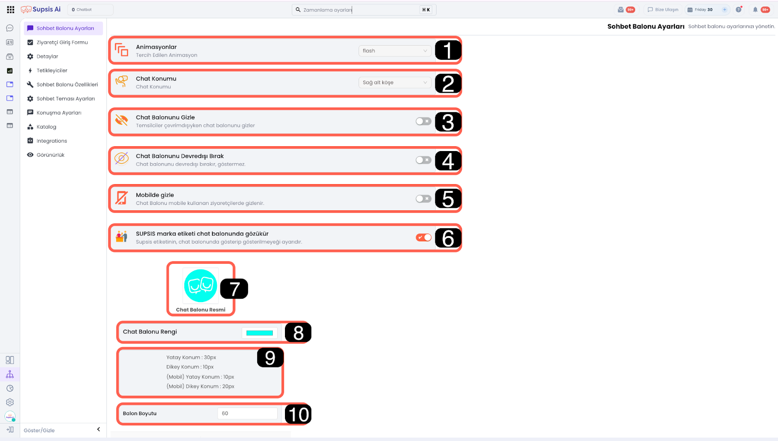 Bu özellik sayesinde, sohbet balonunu sitenizin genel tasarımıyla uyumlu olacak şekilde konumlandırabilir, diğer arayüz öğeleriyle çakışmasını önleyebilir ve dengeli bir yerleşim sağlayarak kullanıcı deneyimini optimize edebilirsiniz.