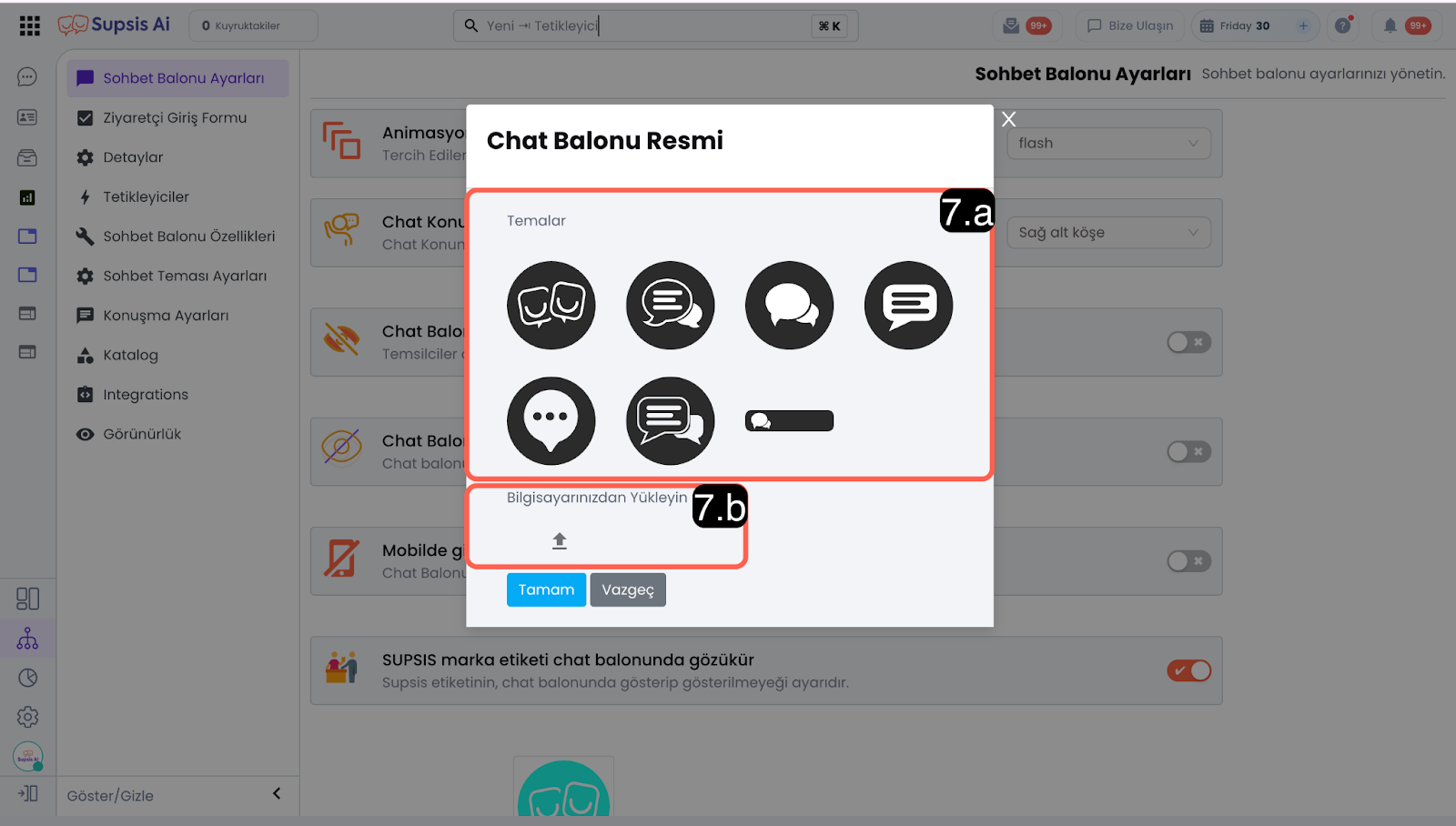 7.b – Bilgisayarınızdan Yükleyin: Bu seçenek ile bilgisayarınızdan kendi sohbet balonu görselinizi yükleyebilirsiniz. Böylece balon tasarımını tamamen özgün ve markanıza özel bir şekilde oluşturabilirsiniz.
