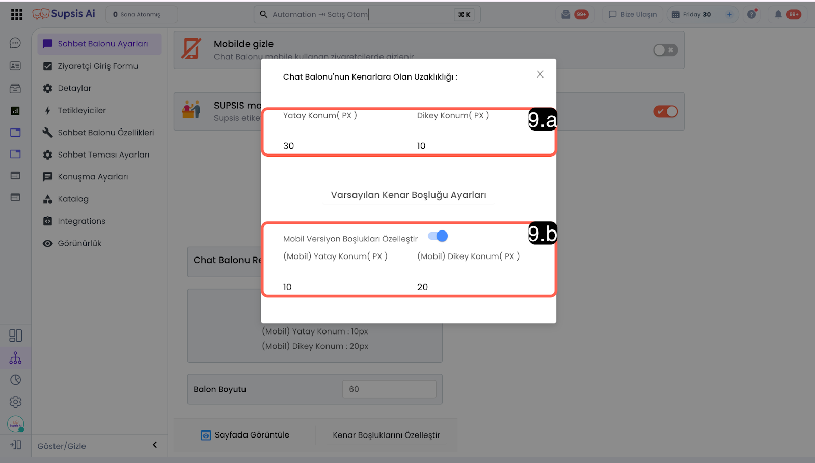 9.a - Web Sürümde Yatak & Dikey Konum: Bu alan üzerinden, web sitenize masaüstü (web) sürüm üzerinden giriş yapan ziyaretçiler için sohbet balonunun yatay ve dikey konumunu özelleştirebilirsiniz. Yapılan ayarlamalar yalnızca web sürümünü etkiler ve masaüstü kullanıcılar için ideal bir konumlandırma sağlar.