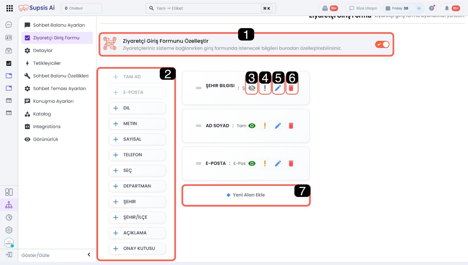- Kapalı: Alan formda görünmez ancak Supsis Ai website scriptleri ile alınan veri; API, SDK veya otomasyonlar aracılığıyla işlenebilir.