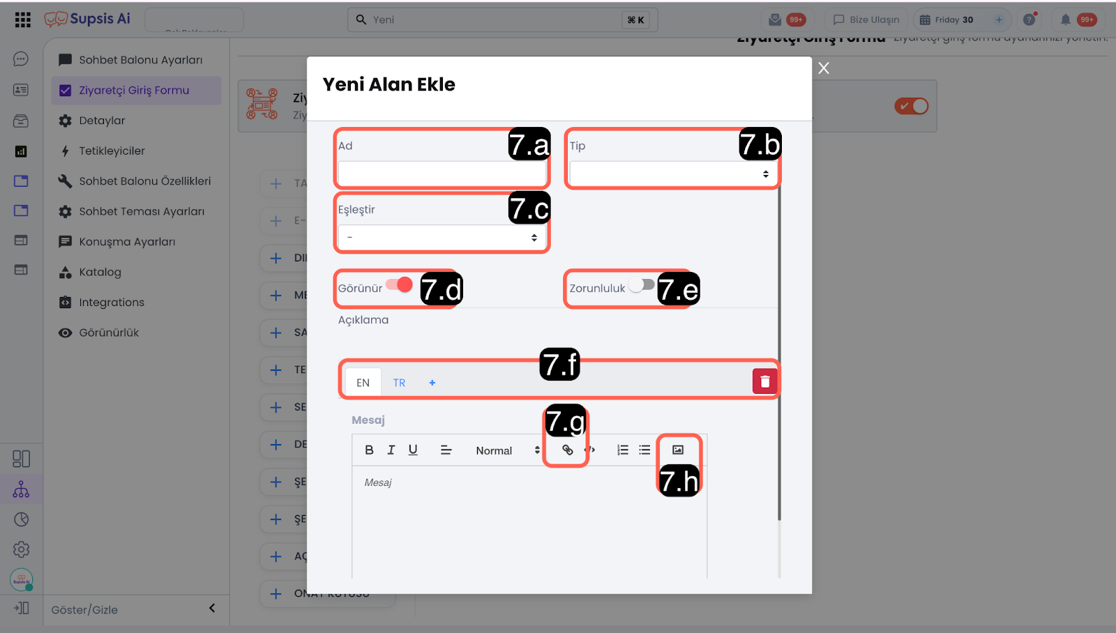 7.e – Zorunluluk: Alanının zorunlu olup olmadığını belirler. Zorunlu olarak işaretlenen alanlar doldurulmadan sohbet başlatılamaz, zorunlu olmayan alanlar boş bırakılarak sohbet başlatılabilir.