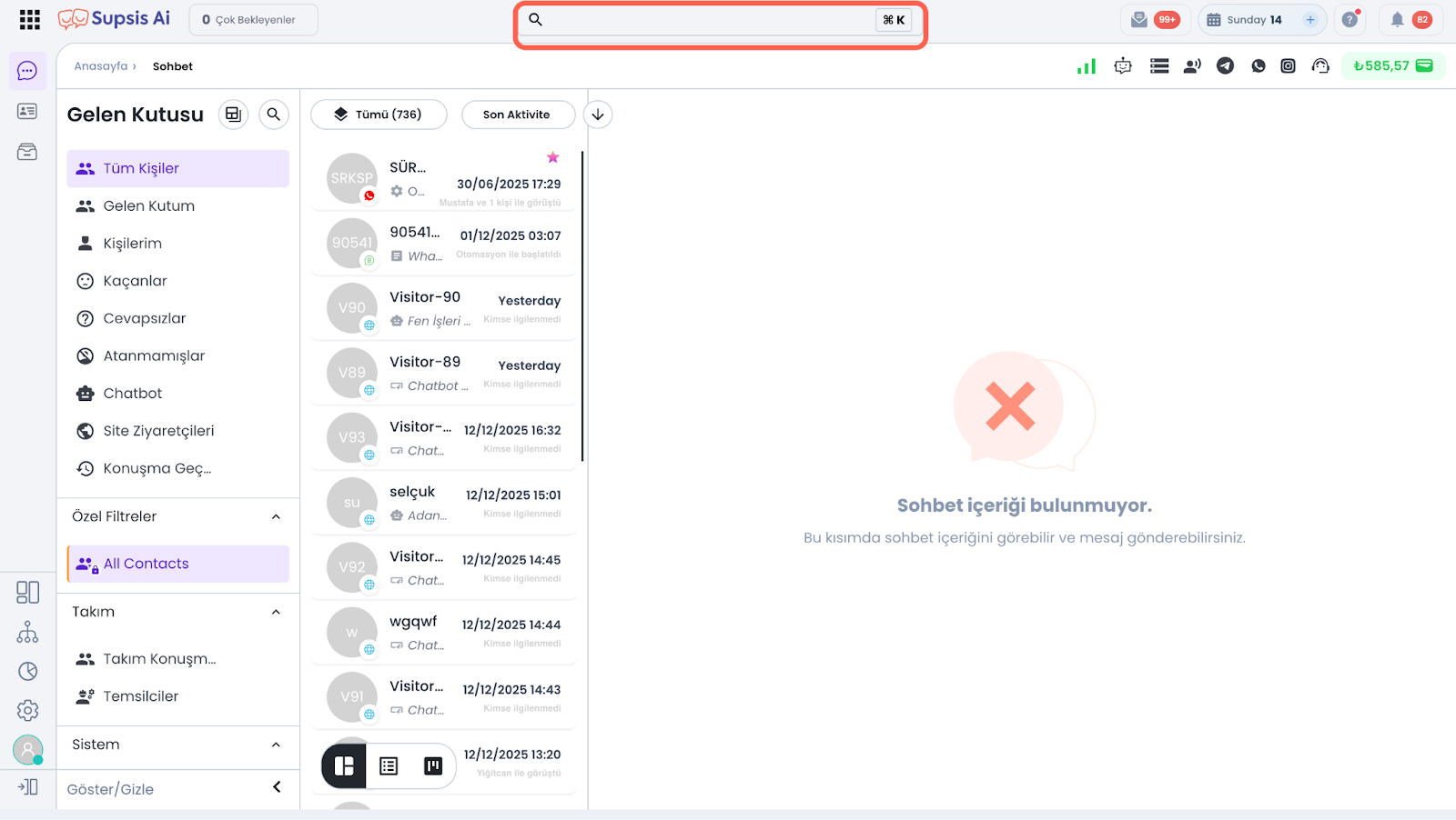 • Chatbot ve otomasyon senaryoları: Chatbot veya otomasyon isimleriyle arama yapılarak ilgili senaryolara hızlıca erişilebilir.