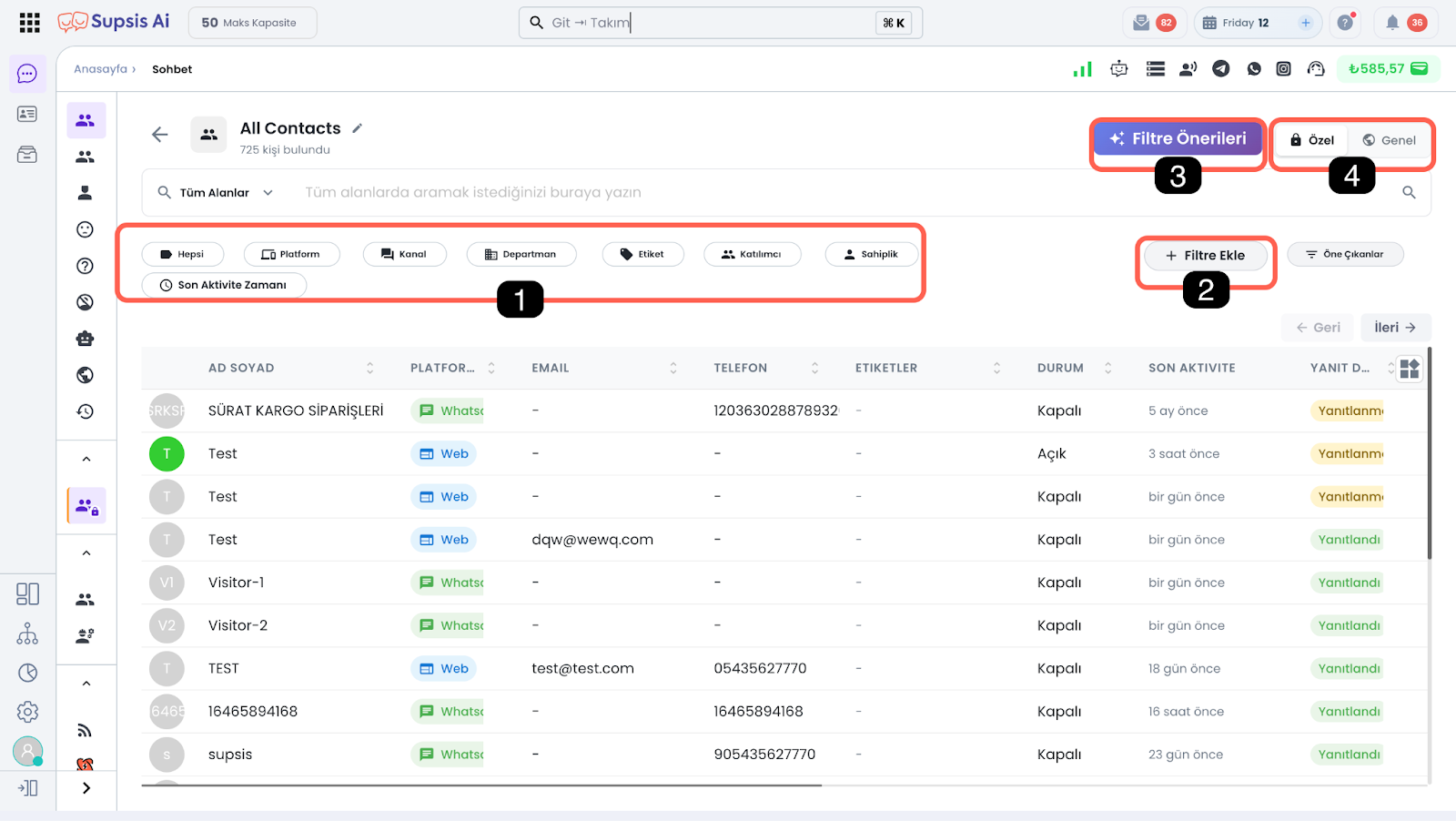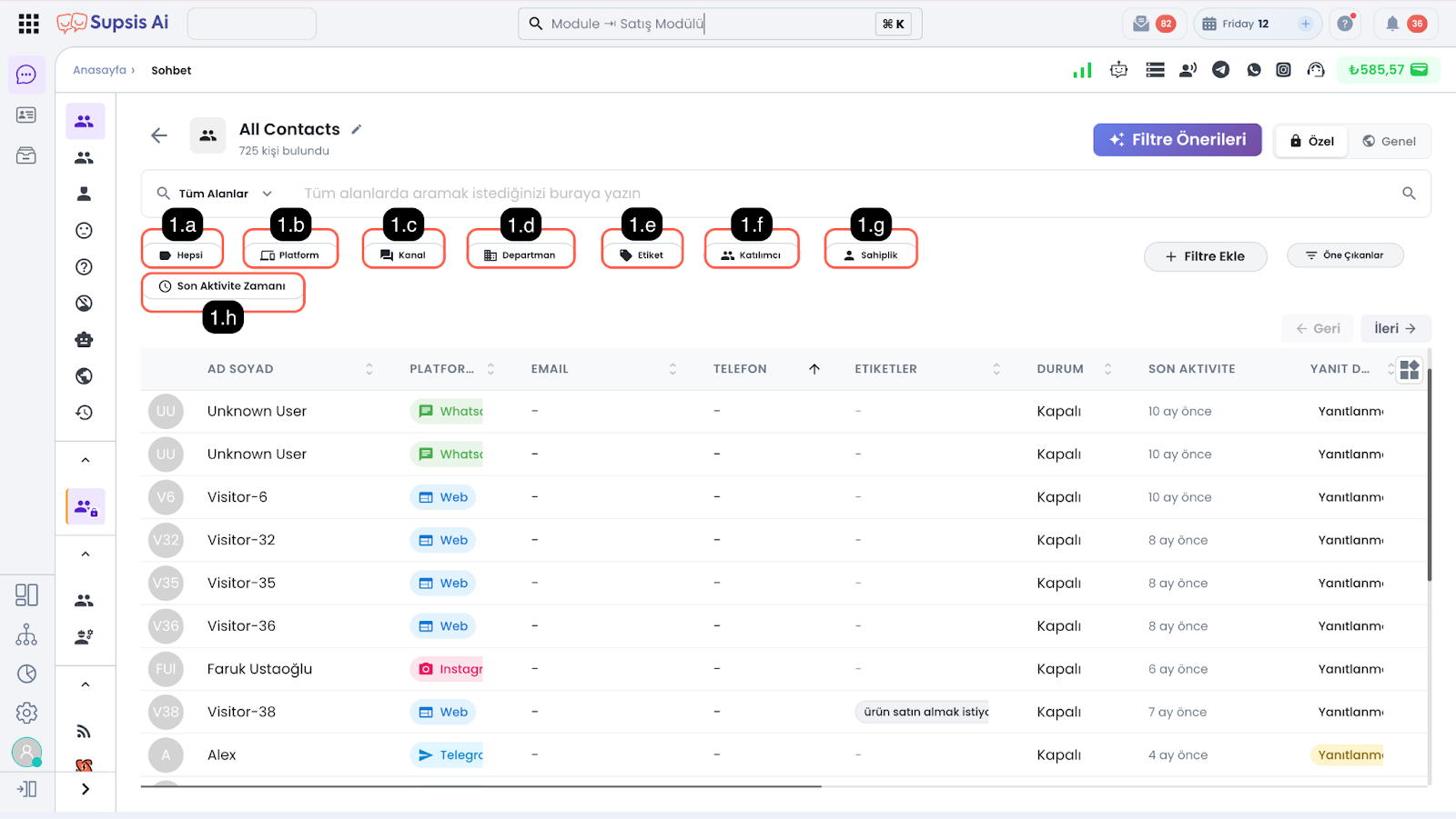 1.c – İletişim Kanalı Supsis panelinizde bağlı olan iletişim kanallarını filtreleyebileceğiniz alandır.