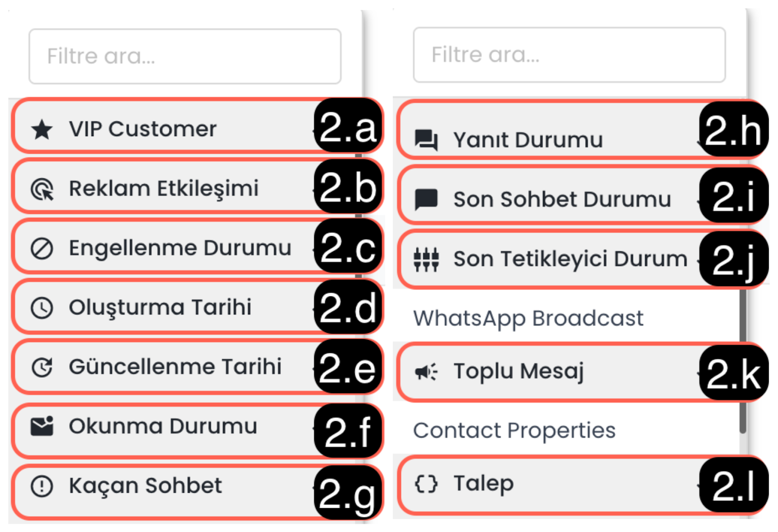 2.l – Kullanıcı Öznitelikleri (Contact Properties) Kişi kartında tanımlı özel alanlara (Profil alanları, dinamik özellikler vb.) göre filtreleme yapılmasını sağlar. Özel alan oluşturmak ve kullanımı hakkında daha detaylı bilgi almak için Profil Alanları dokümanını inceleyebilirsiniz.