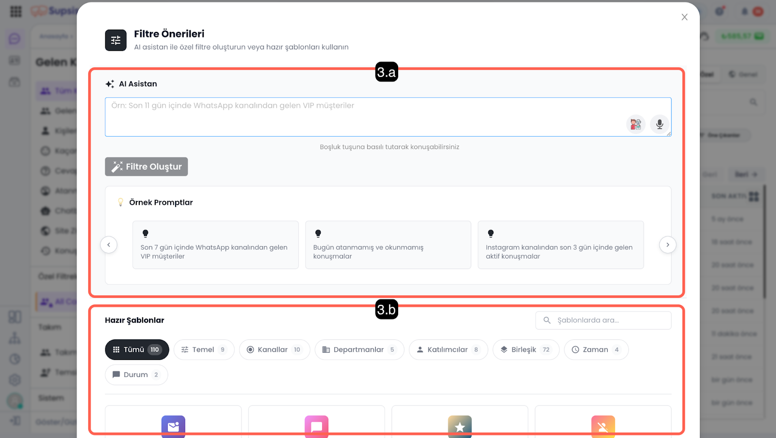 Yapay zekâya görüntülemek istediğiniz konuşma kriterlerini tanımlayarak otomatik filtre önerileri alabilir veya hazır şablonlar arasından ihtiyacınıza uygun olanı seçerek filtreleme işlemini gerçekleştirebilirsiniz.