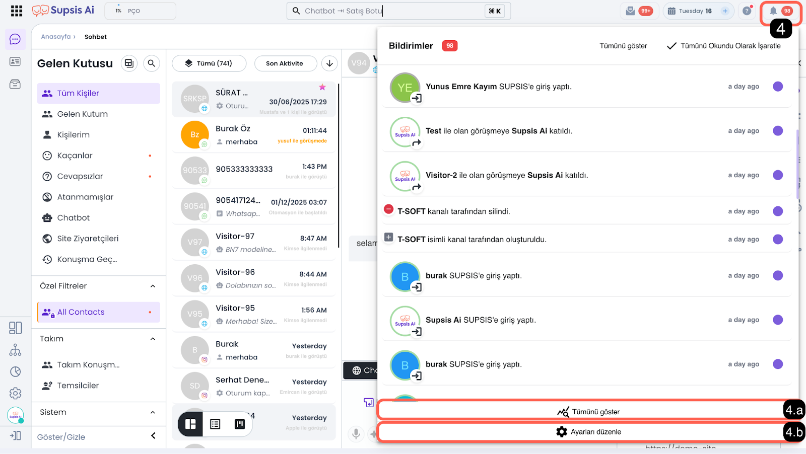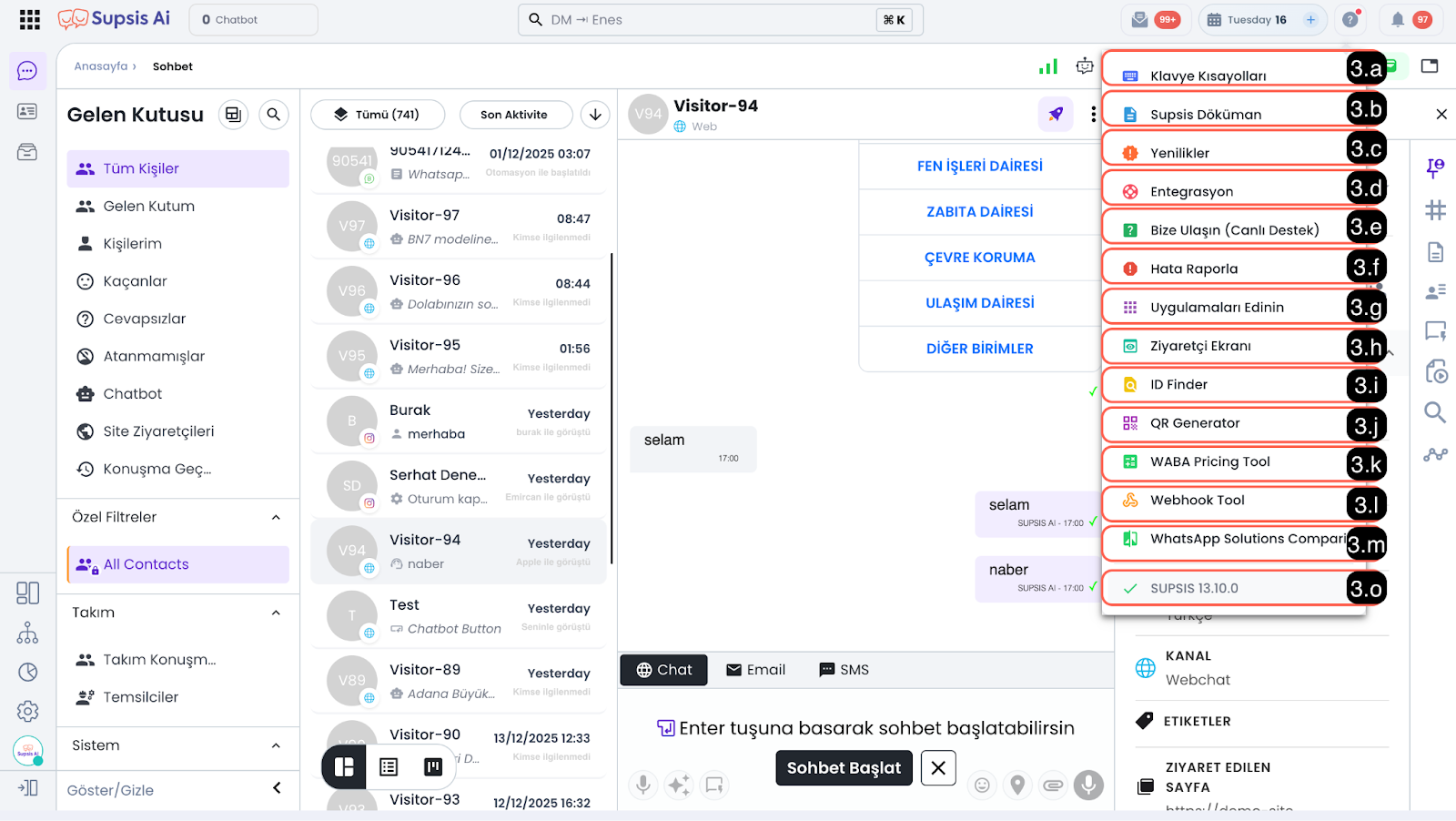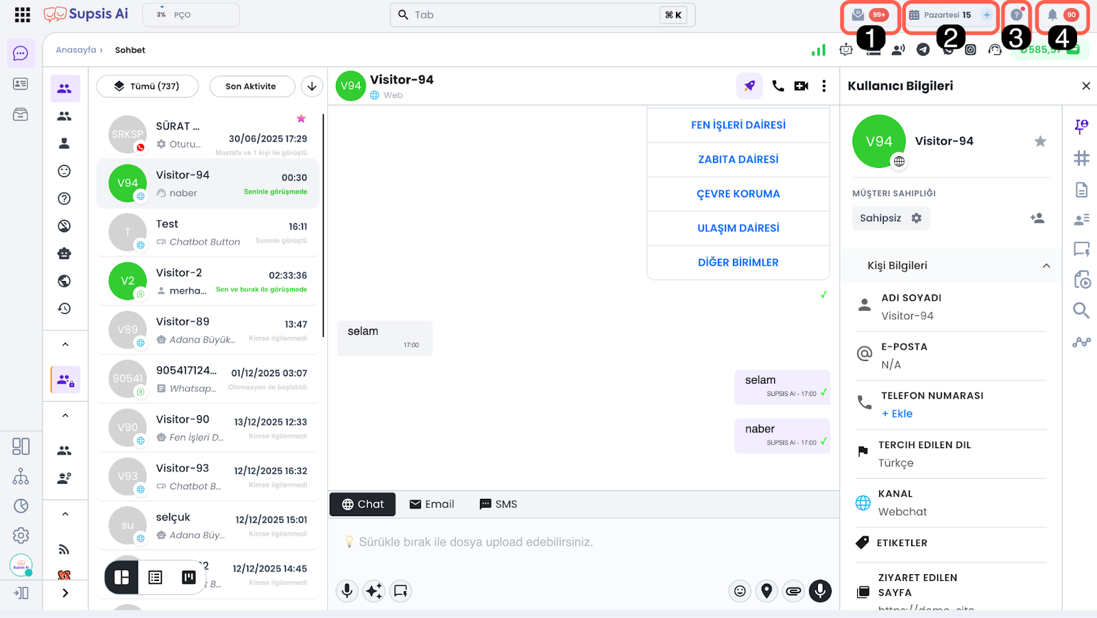 • 3.h – Ziyaretçi Ekranı: Web sitenizi ziyaret eden kullanıcıların göreceği sohbet balonunu simüle edebileceğiniz ve test edebileceğiniz ziyaretçi ekranını açar. Bu ekran üzerinden mesaj göndererek panelinizde test sohbetleri başlatabilirsiniz.