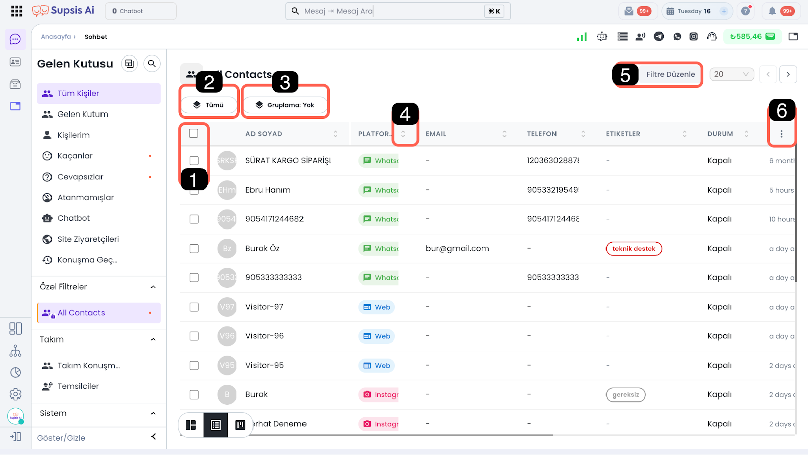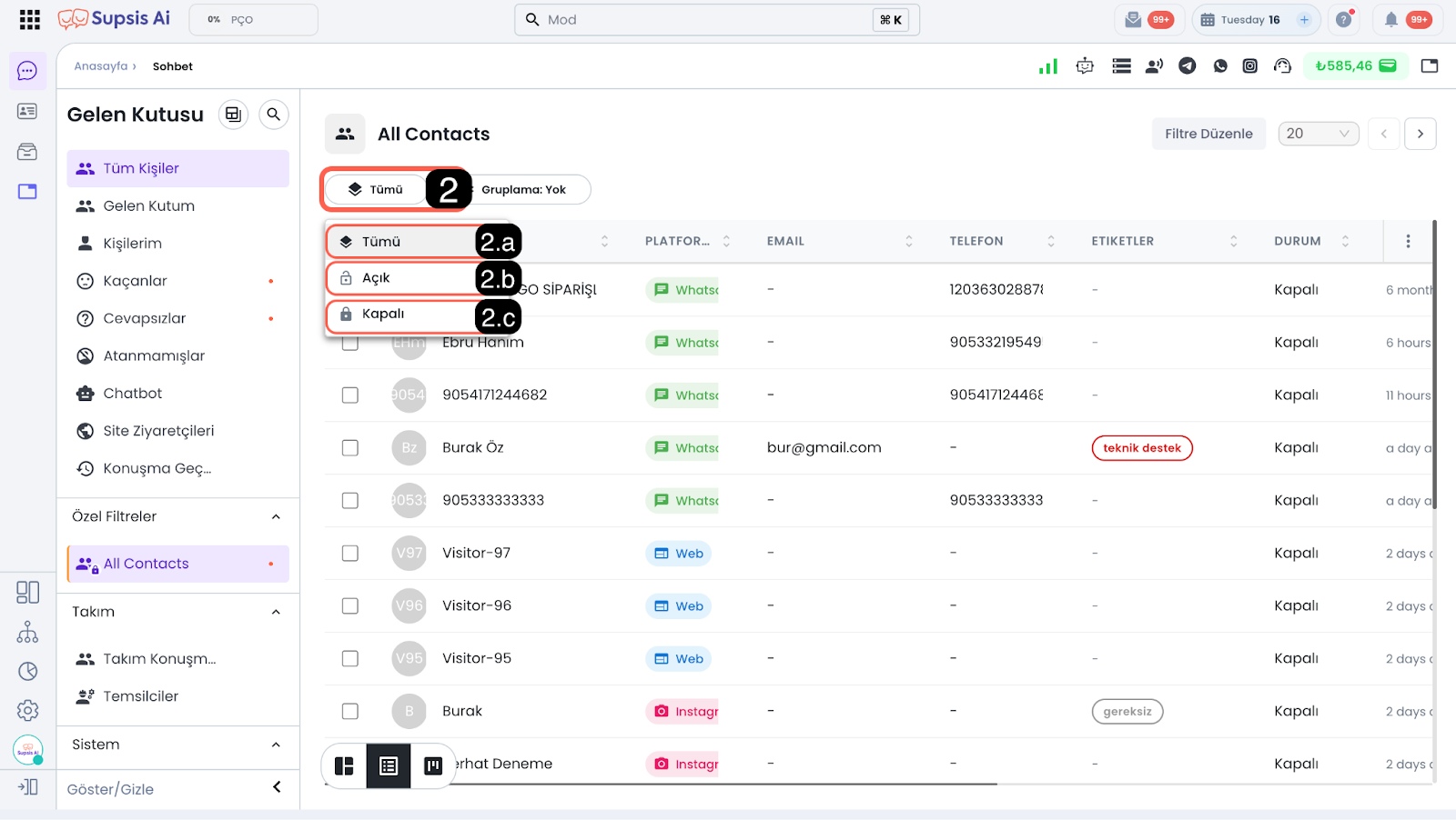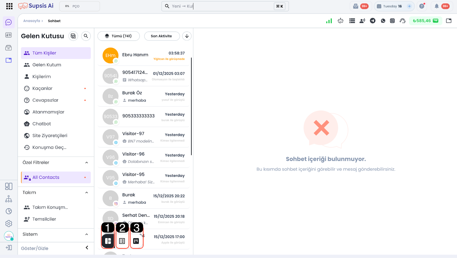 Bu araç, tablo görünümünde yer alan kişilerin sohbet durumlarına göre hızlı ve düzenli bir şekilde görüntülemenizi sağlar. Bu araç üzerinden açık, kapalı veya tüm sohbetleri tek tıklamayla ayırabilir; aktif görüşmeleri olan kişilere odaklanabilir ya da kapalı sohbetleri kolayca inceleyebilirsiniz. Böylece sohbet yönetimini daha verimli ve kontrollü bir şekilde gerçekleştirebilirsiniz