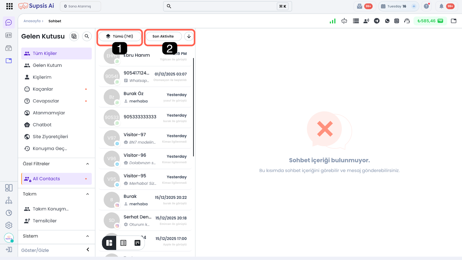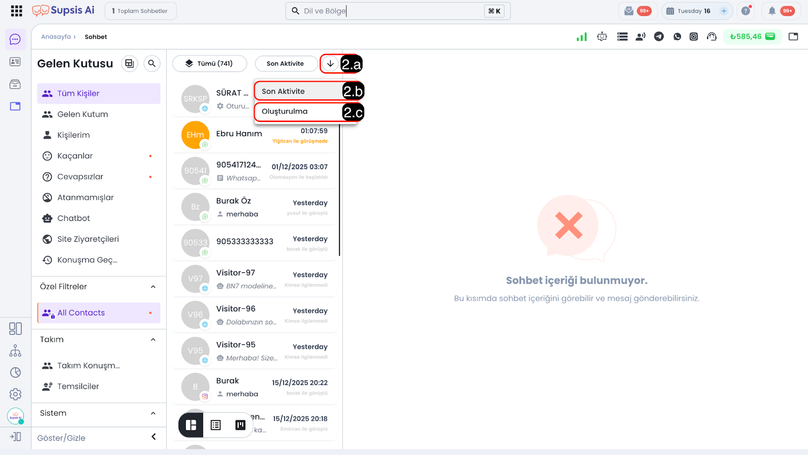 2.b – Son Aktivite: Sohbet içerisinde gerçekleştirilen en son işleme göre sıralama yapar. Bu araç en güncel etkileşimleri baz alarak, artan/azalan türde sıralama yapmanıza en güncel veya en eski etkileşime sahip sohbetlere odaklanmanıza olanak tanır.