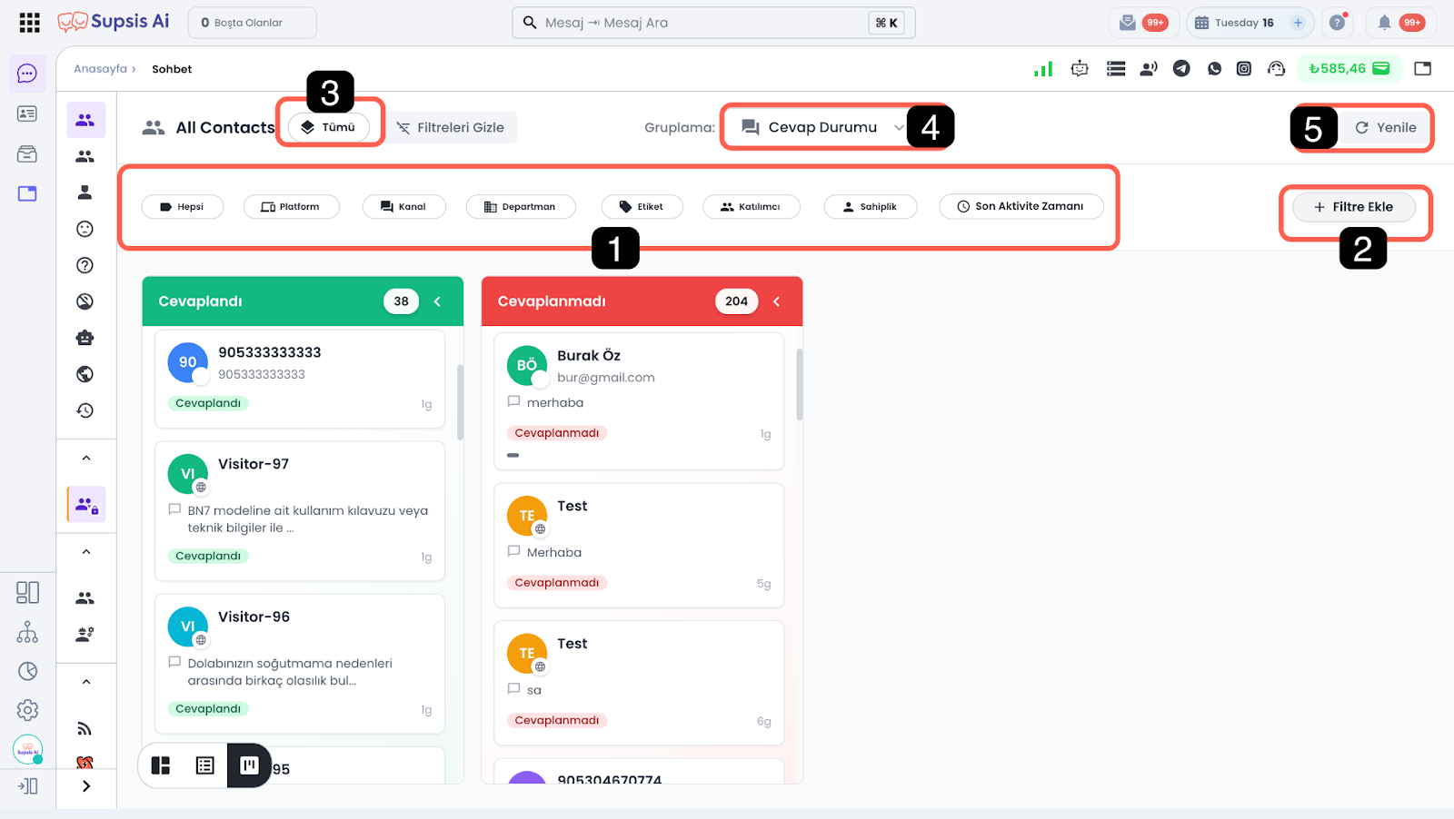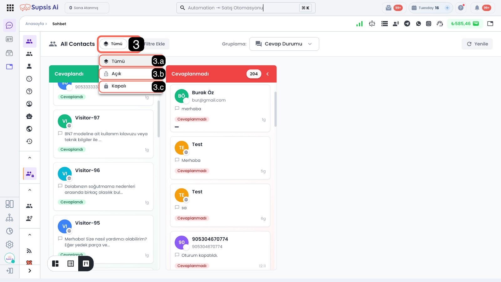- Cevap Durumu: Sohbetleri cevaplandı ve cevapsız durumlarına göre gruplandırır. Bu sayede yanıt bekleyen sohbetleri hızlıca tespit edebilir ve aksiyon alabilirsiniz.