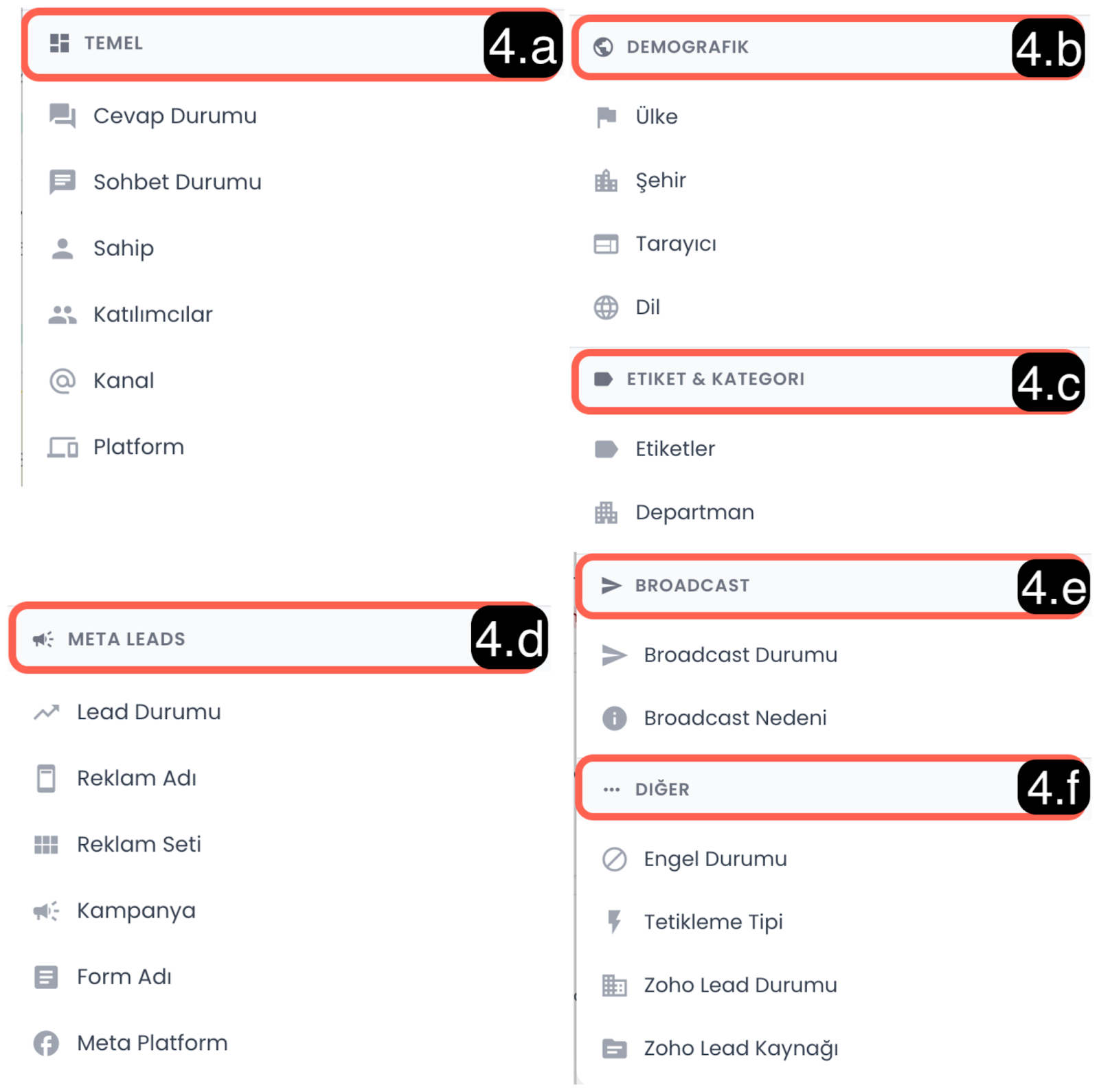 4.e - Brodcast: Broadcast gruplandırma seçeneği, toplu mesaj (broadcast) gönderimleriyle ilişkili sohbetleri; gönderim durumu ve olası hata nedenlerine göre gruplandırmanızı sağlar. Bu alan, toplu gönderim süreçlerinin takibini kolaylaştırır ve gönderim sırasında yaşanan sorunları hızlıca tespit etmenize yardımcı olur.