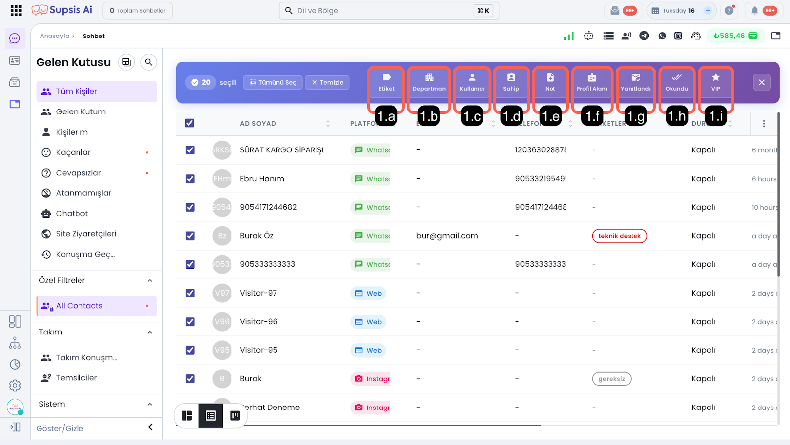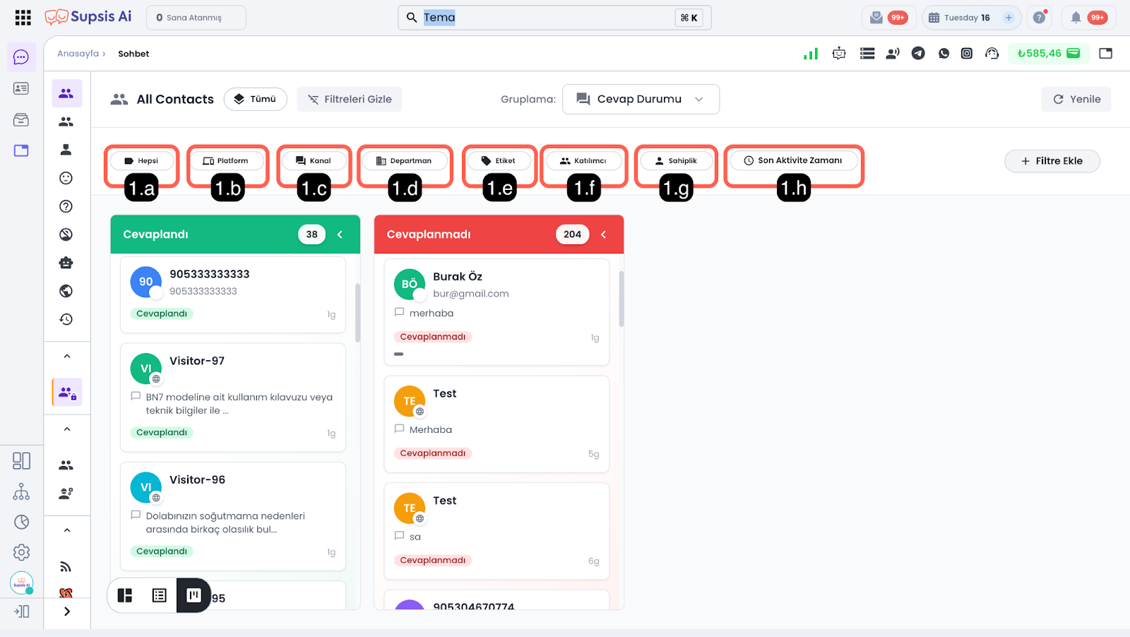 - 1.e – Etiket: Kanban panosundaki sohbetler arasından, yalnızca belirlediğiniz etiketlere sahip olan konuşmaları filtreleyerek görüntülemenizi sağlar.