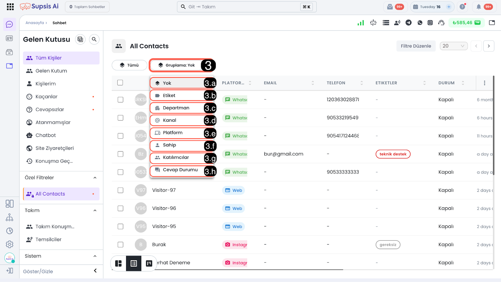 3.h –Cevap Durumu: Sohbetleri, yanıt durumlarına göre gruplandırır. Örneğin Yanıt Bekleyen, Yanıtlandı veya Cevapsız durumlar ayrı gruplar halinde listelenir. Bu gruplama, öncelikli aksiyon alınması gereken sohbetlerin hızlıca tespit edilmesini sağlar.