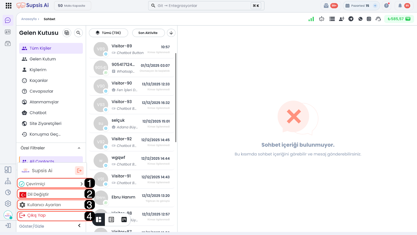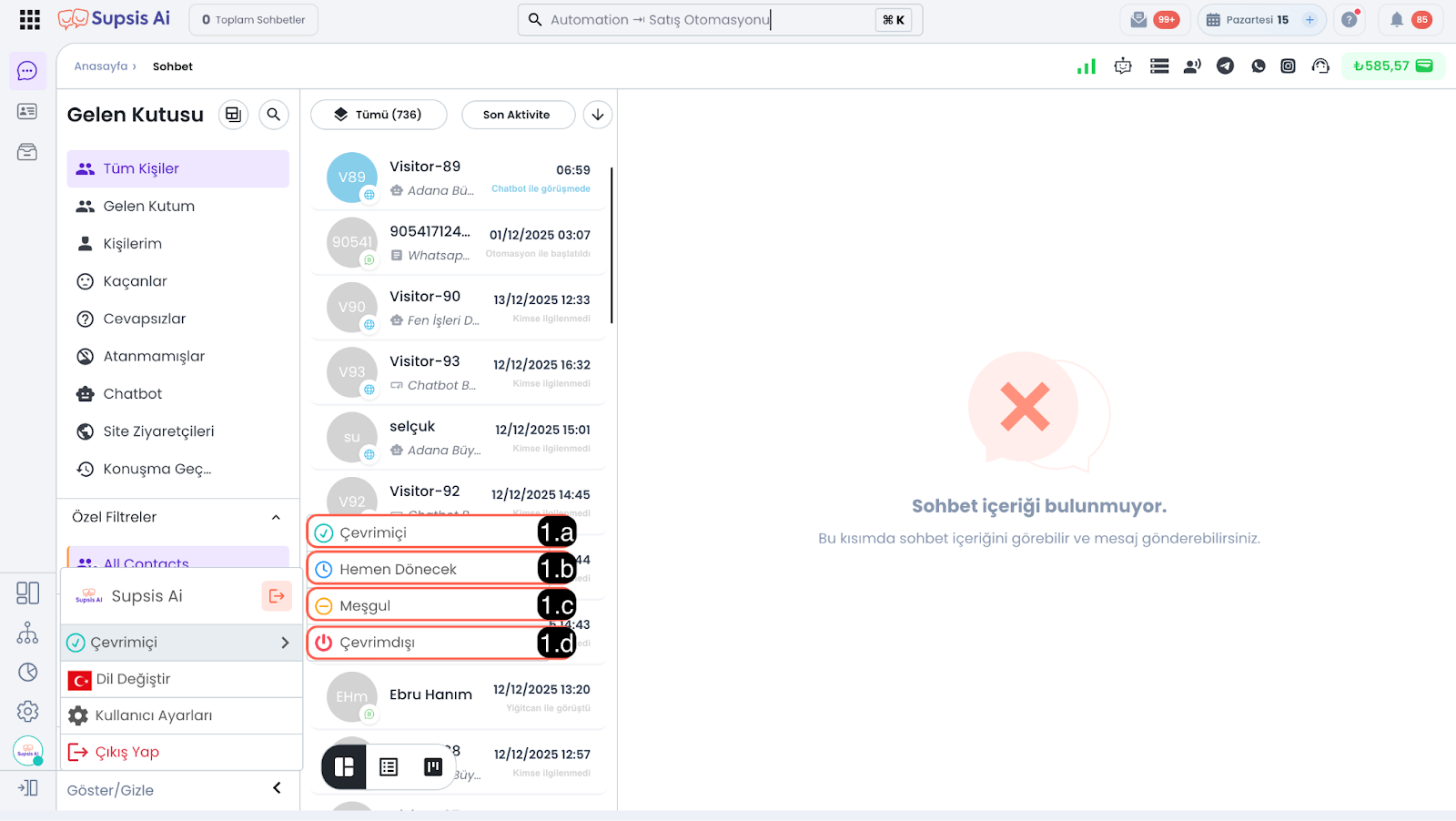 Not: “Çevrimiçi” statüsü dışındaki tüm durumlar, sohbet atamalarını durdurur. Ancak farklı statü seçenekleri; temsilcinin ekip içindeki durumunu daha net ifade etmek, yöneticilere bilgi sağlamak ve raporlama süreçlerinde daha detaylı kayıt tutulabilmesi amacıyla sunulmaktadır.